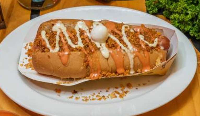 Salchicha, queso mozzarella, tocineta, papas tostadas, salsas y huevo de codorniz.