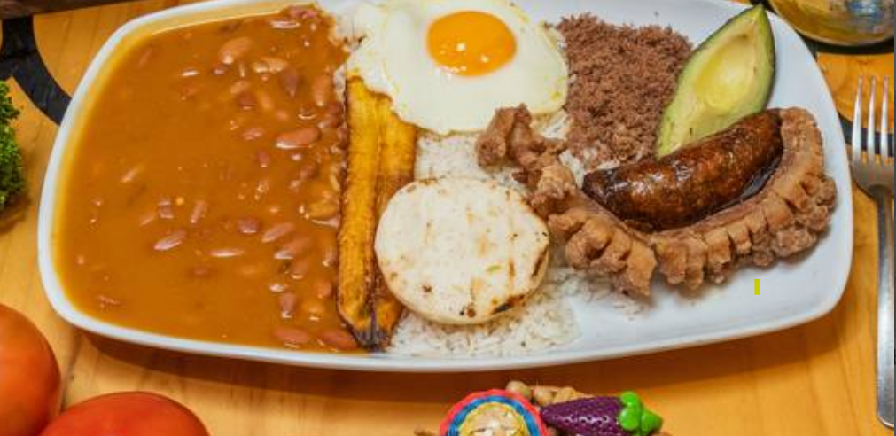 Arroz, frijoles, chicharrón, chorizo, carne molida, maduro, huevo frito, aguacate y arepa. Plato típico.