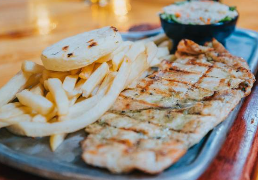 Res, pollo, tocineta y maíz dulce. Papas fritas, ensalada al gusto y refresco de piña natural de la casa.