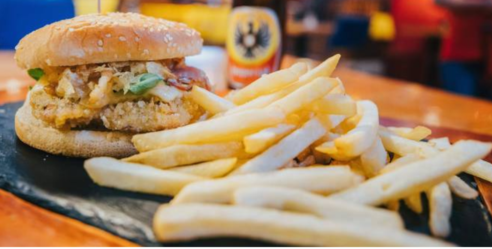 1/4 lb de Torta de carne, pechuga a la parrilla, lechuga, queso mozzarella, tocineta, cebolla, papas tostadas.