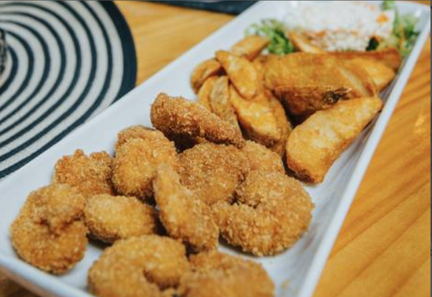 Camarones empanizados acompañados de papas fritas.