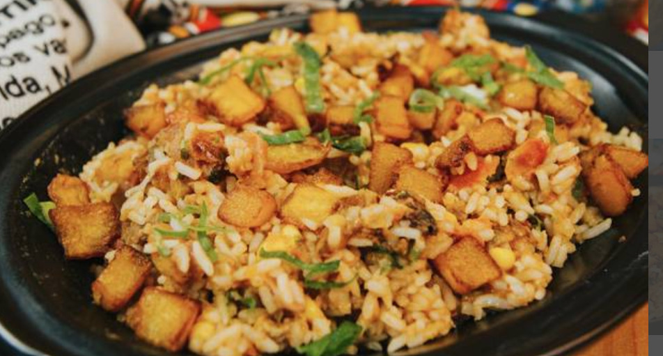 Arroz, frijoles, hogao, chorizo, chicharrón, maduro y maíz dulce.