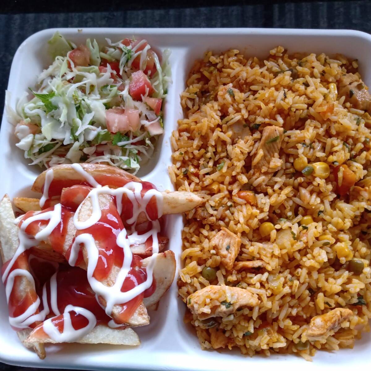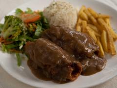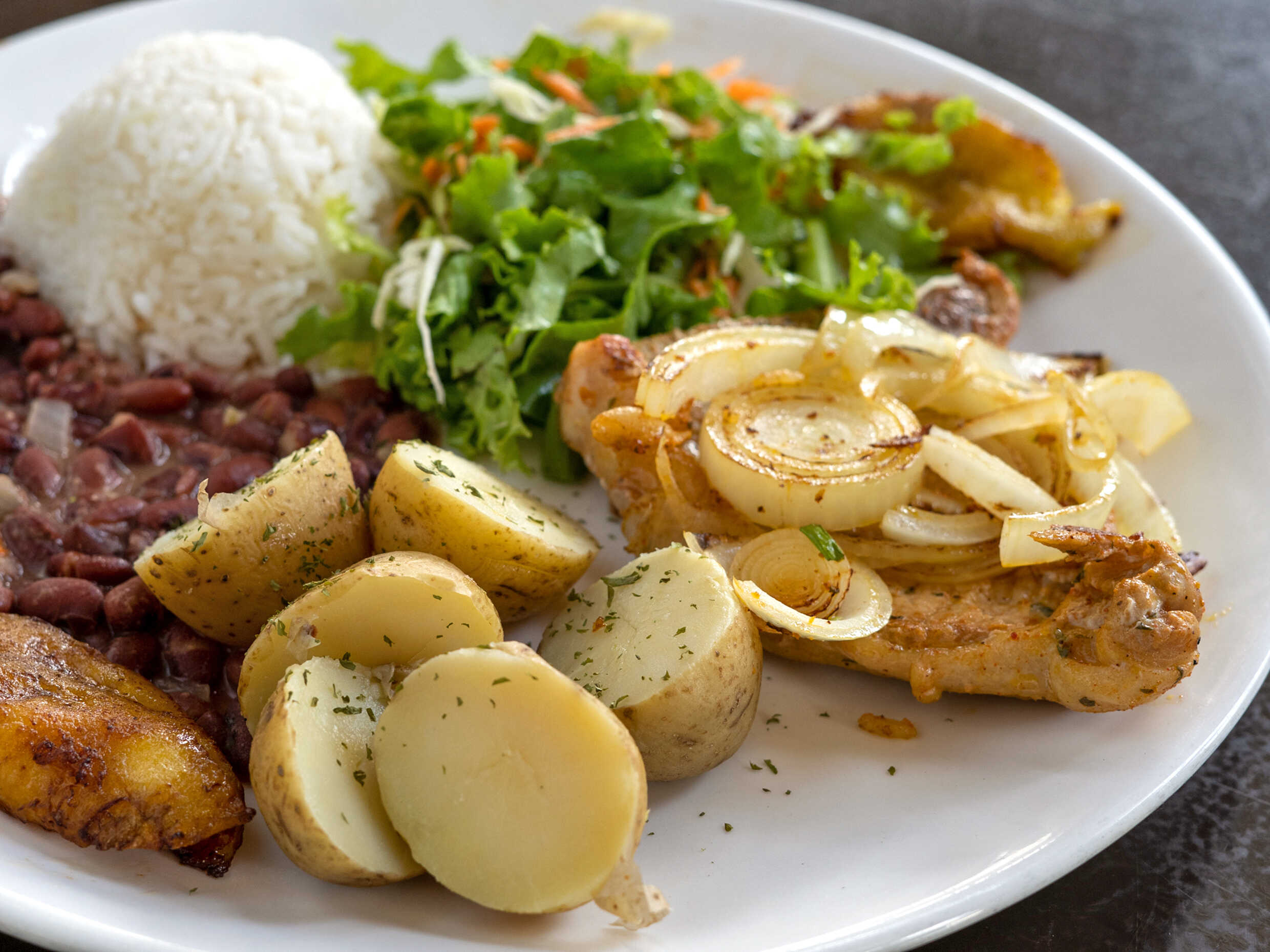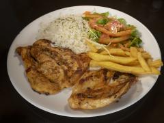 Con bistec, chuleta, pollo o pescado.