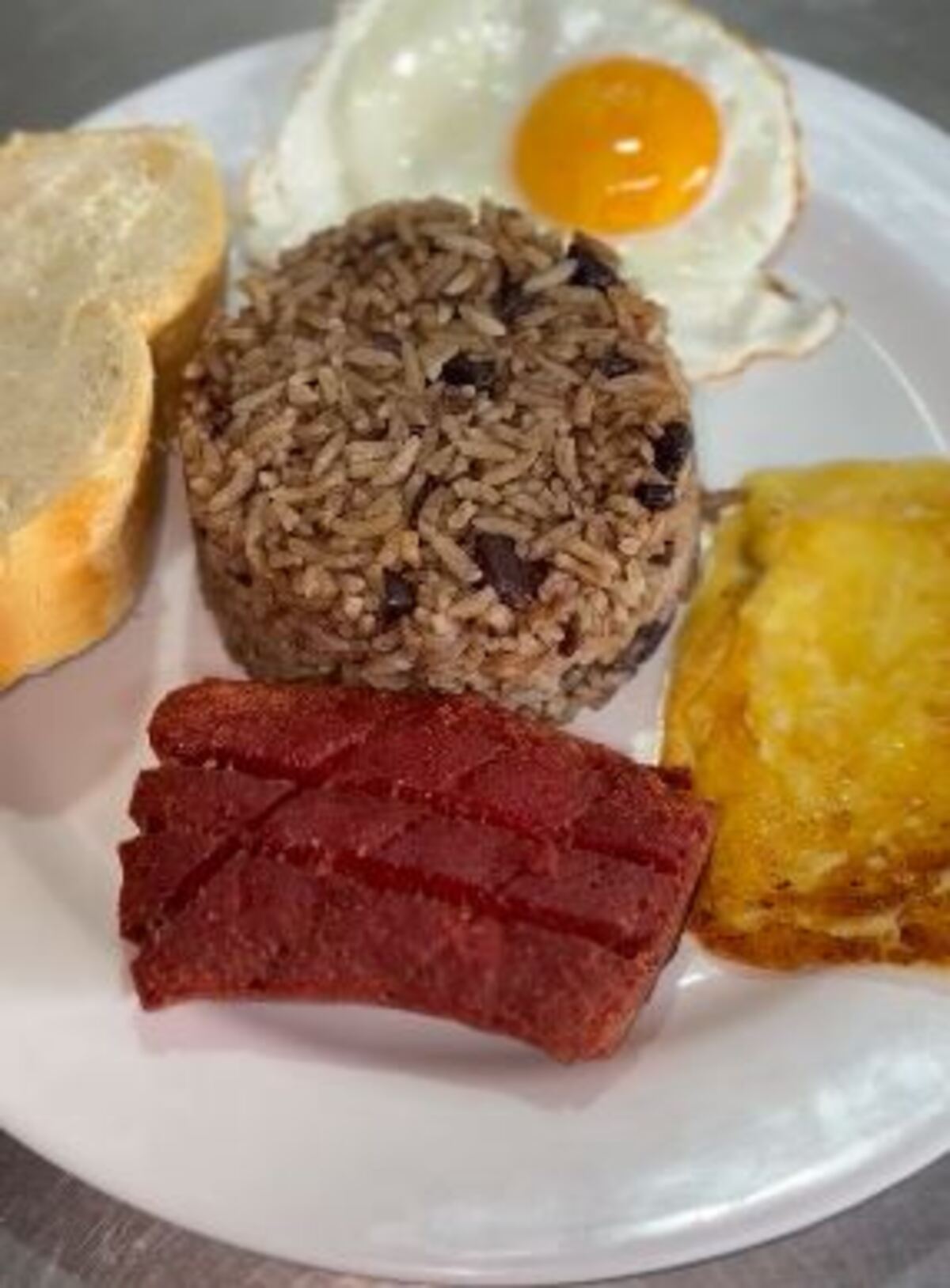 Delicioso gallo pinto, huevo, queso, salchichón, maduros y tortilla palmada.