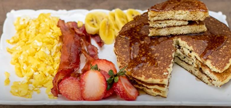 Delicioso, 2 panqueques, huevo y tocino o frutas frescas y miel de maple.