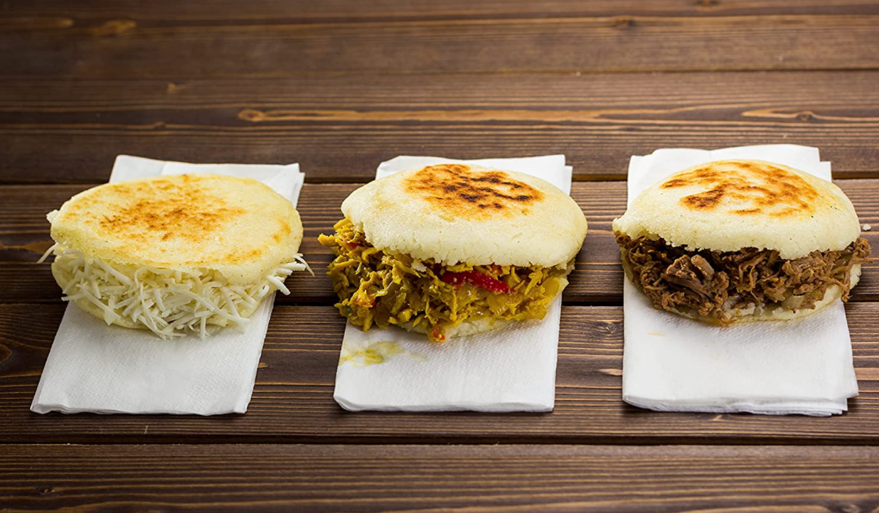 Arepa, huevos revueltos con tomate y cebolla, queso blanco, carne mechada y bebida (café o jugo de naranja)