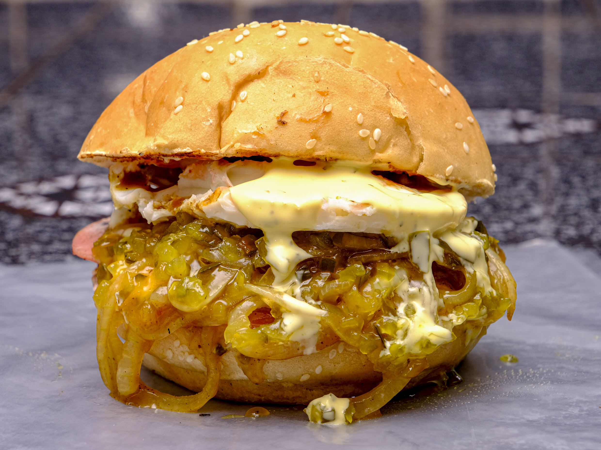 Pan Brioche, Torta, jamón, queso cebolla sofrita, pepinillo, huevo, salsa especial y ketchup.