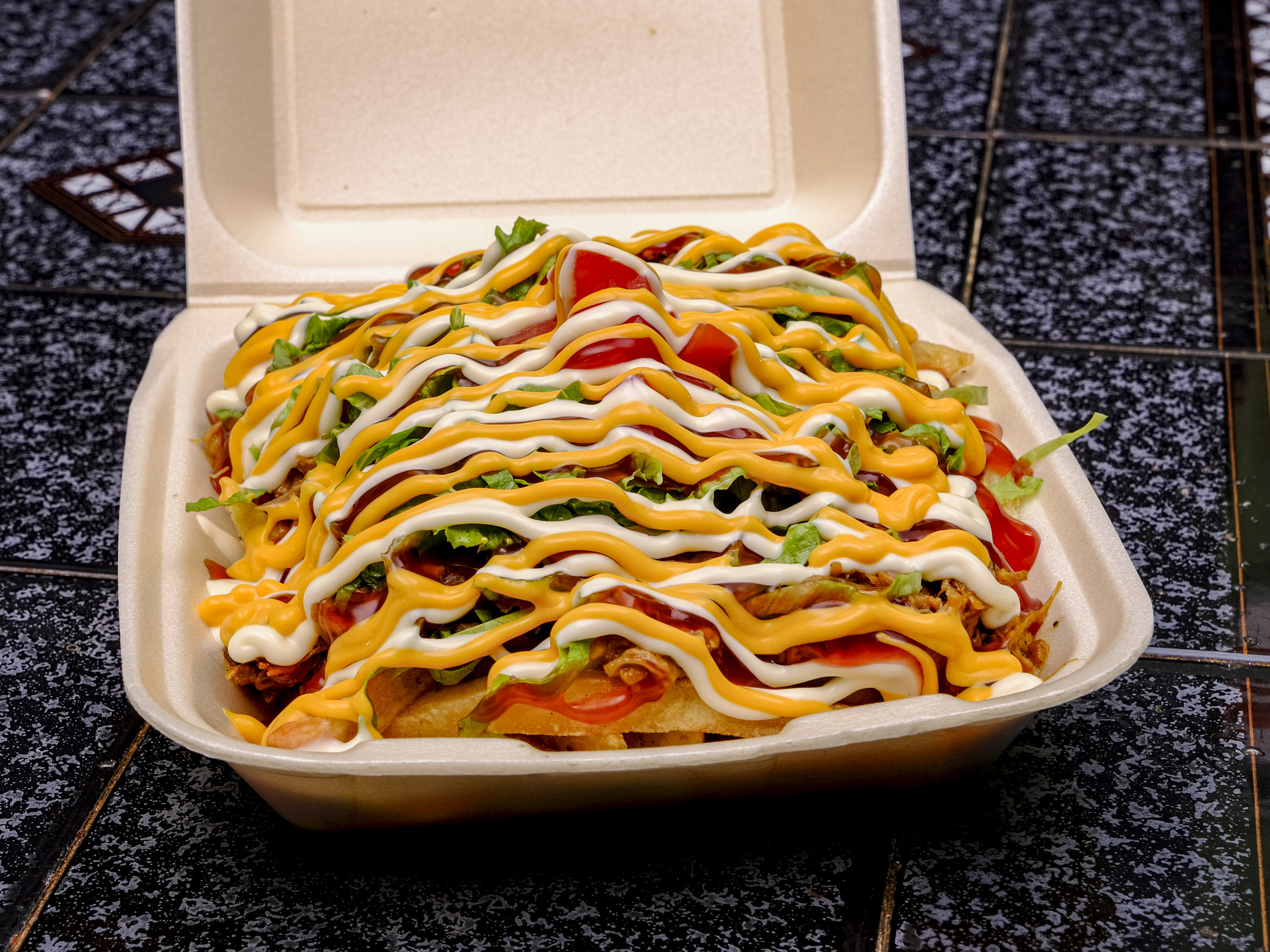 Papas fritas, cubiertas con frijoles molidos, carne mechada, lechuga fresca, tomate picado, kétchup, mayonesa y queso cheddar.