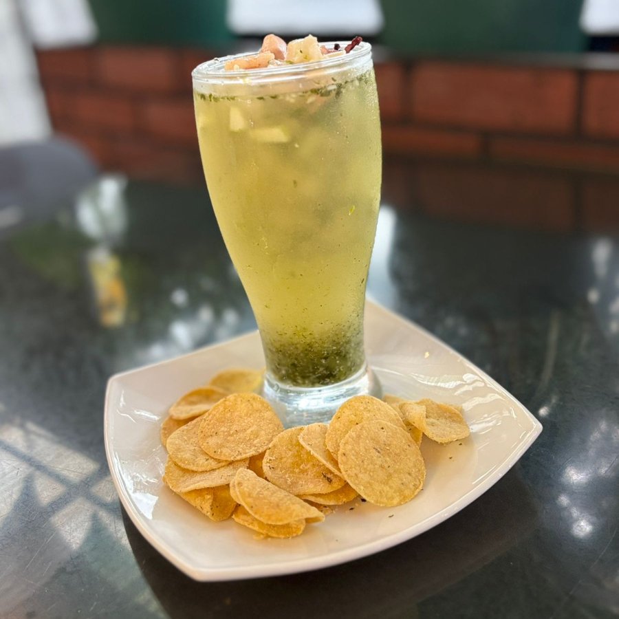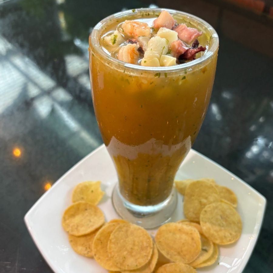 Especialidad de la casa en vaso con mezcla de mariscos y salsa de tomate.