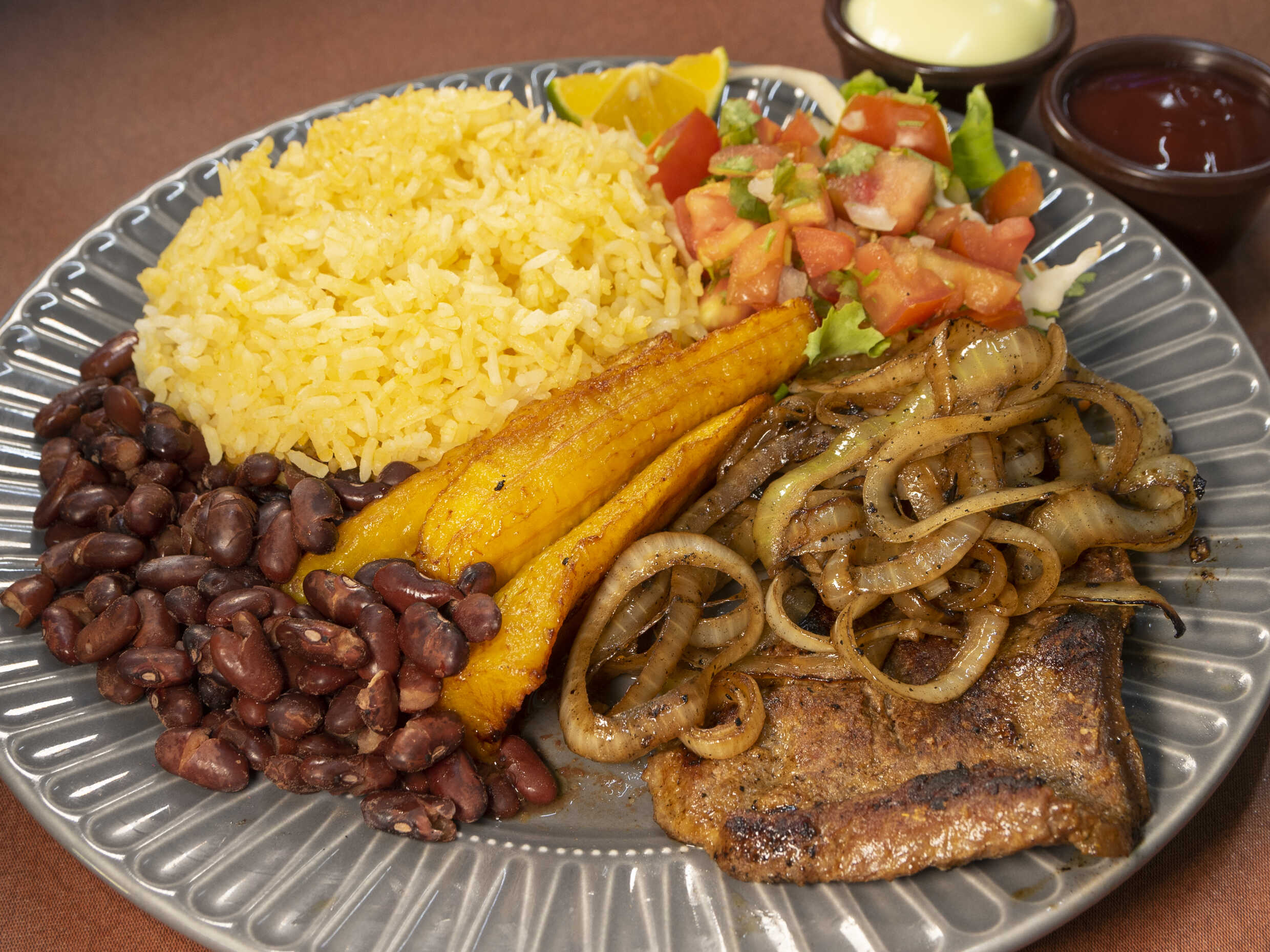 250g de arroz, 150g de frijoles, ensalada del día, plátano maduro y la proteina a elegir acompañada de una bebida del día