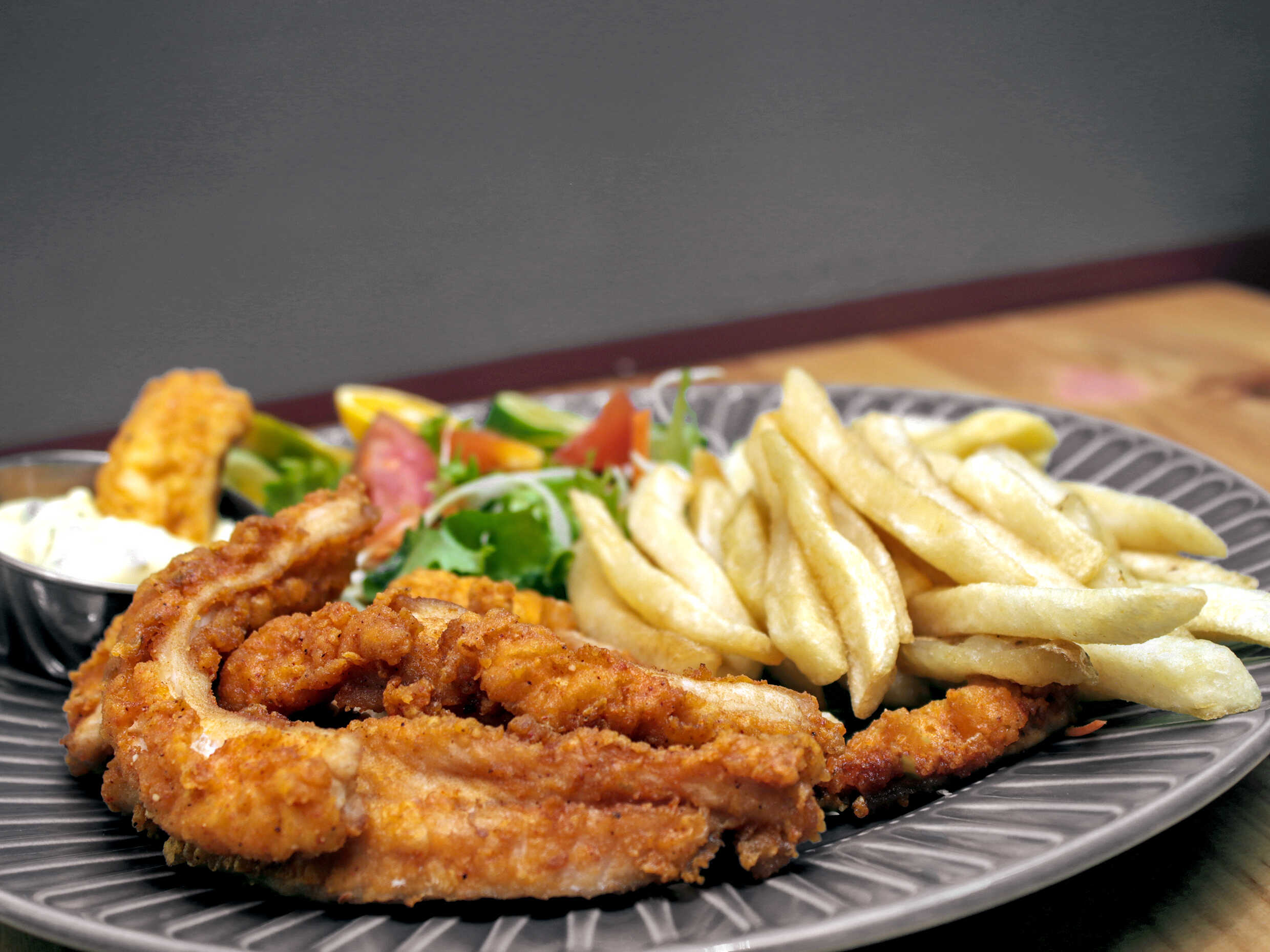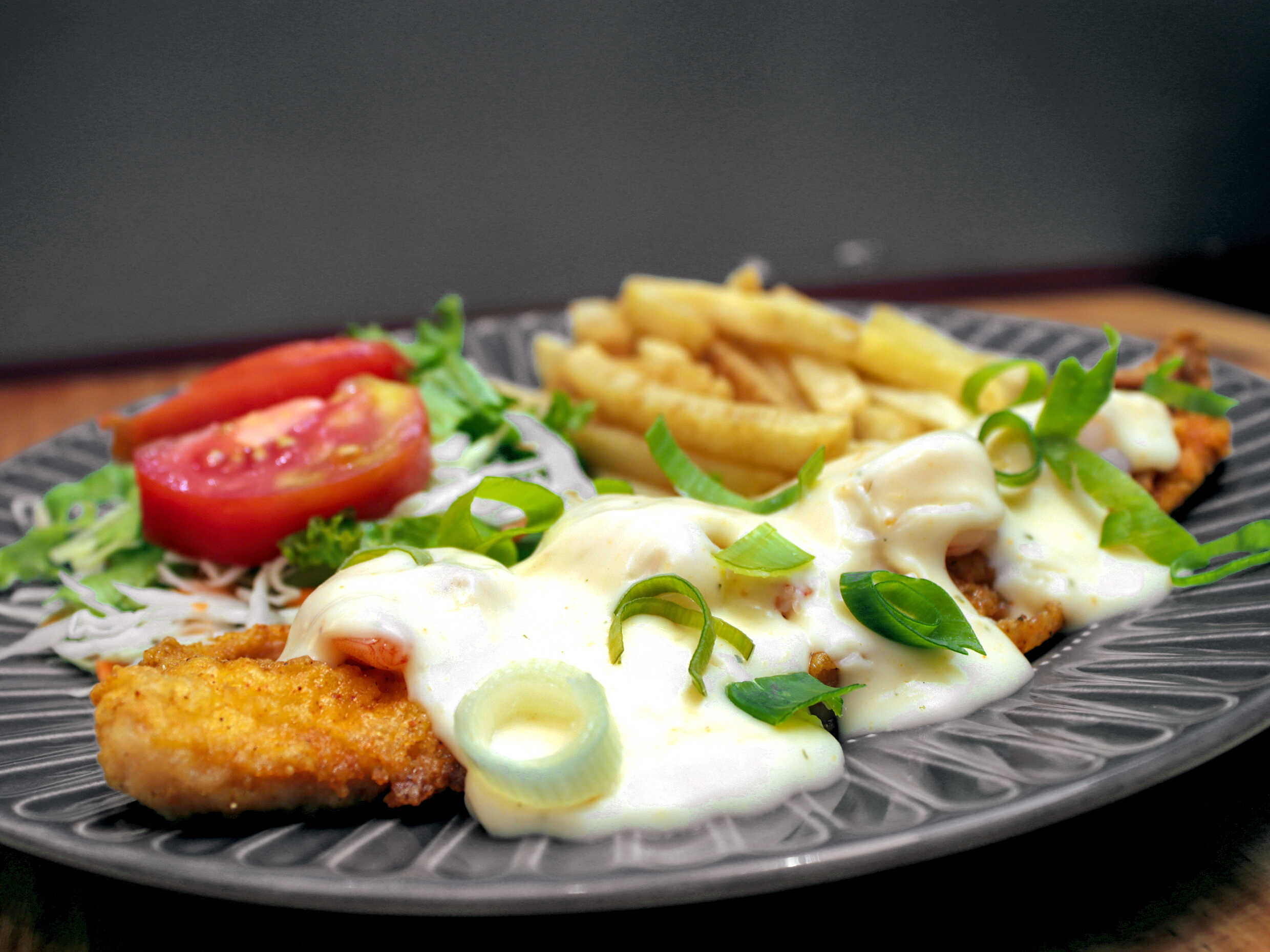 Jugoso y crujiente filete de pescado empanizado, acompañado con papas fritas y ensalada del día más nuestra salsa tártara.