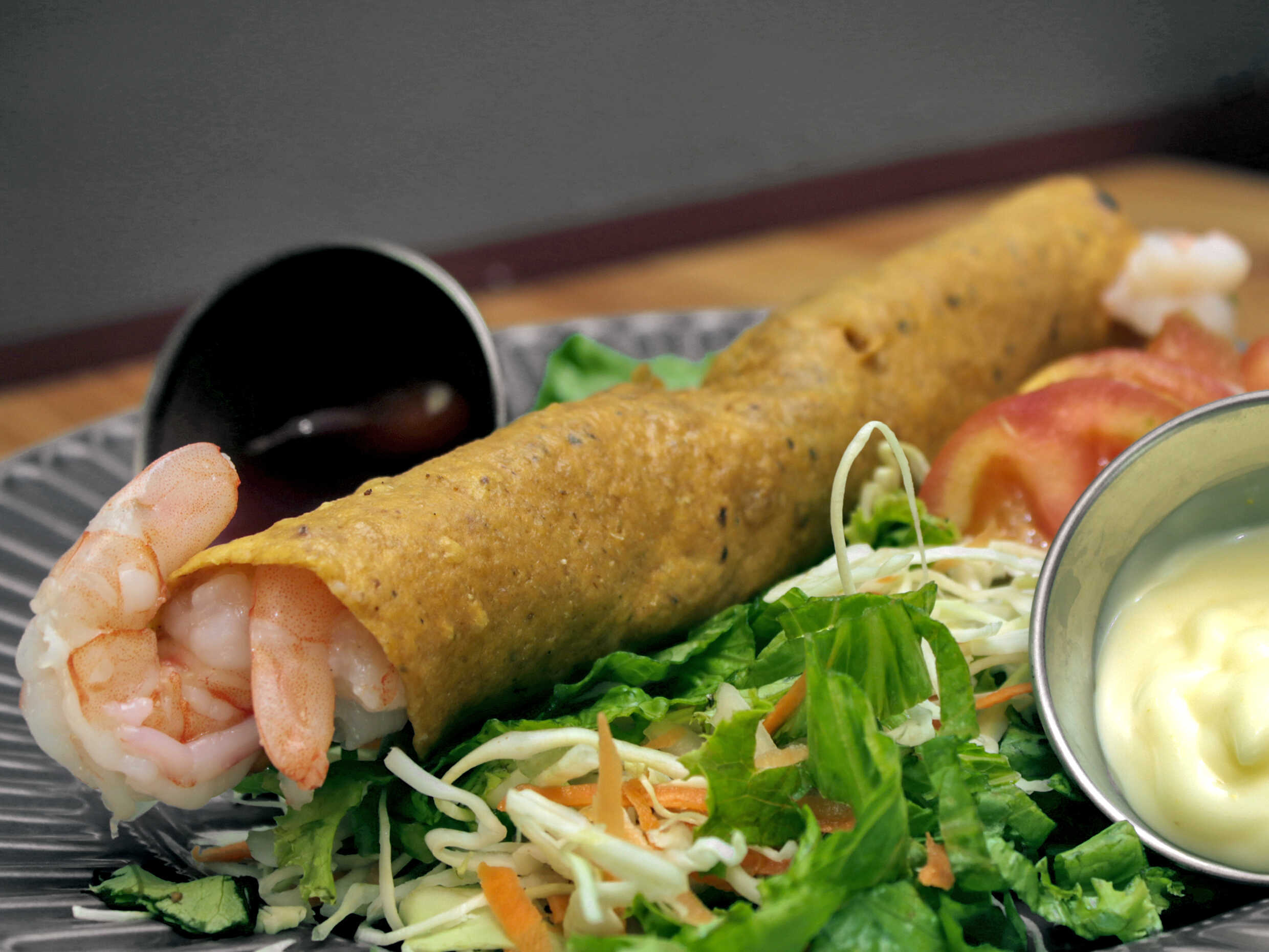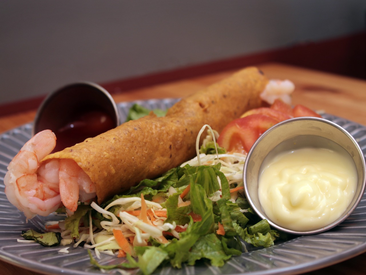 1 Taco grande relleno de deliciosos camarones, acompañado de ensalada verde (lechuga, tomate, zanahoria y repollo).