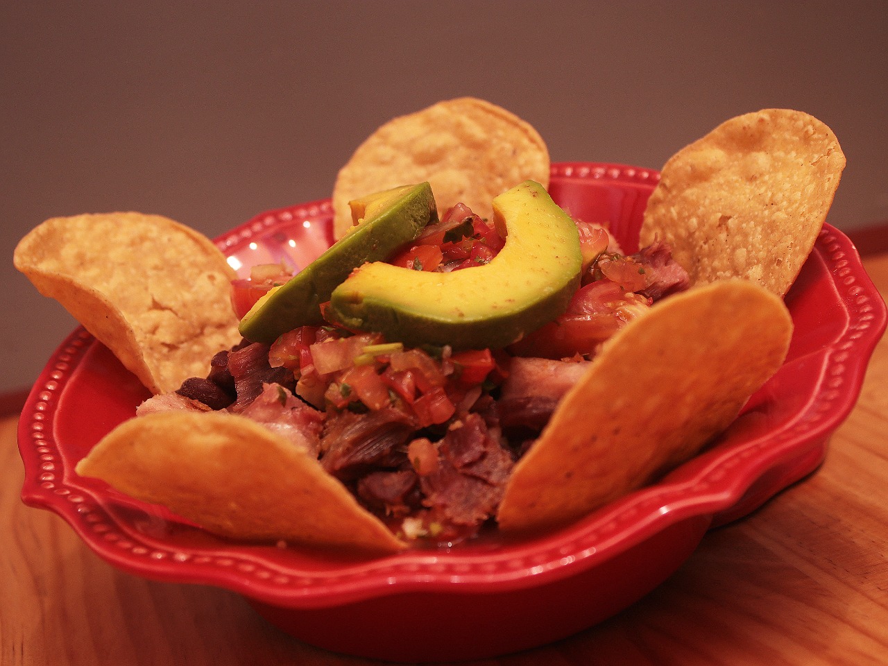 Deliciosa combinación de arroz, frijoles tiernos, chicharrón de cerdo, pico de gallo, aguacate y tortillas tostadas.