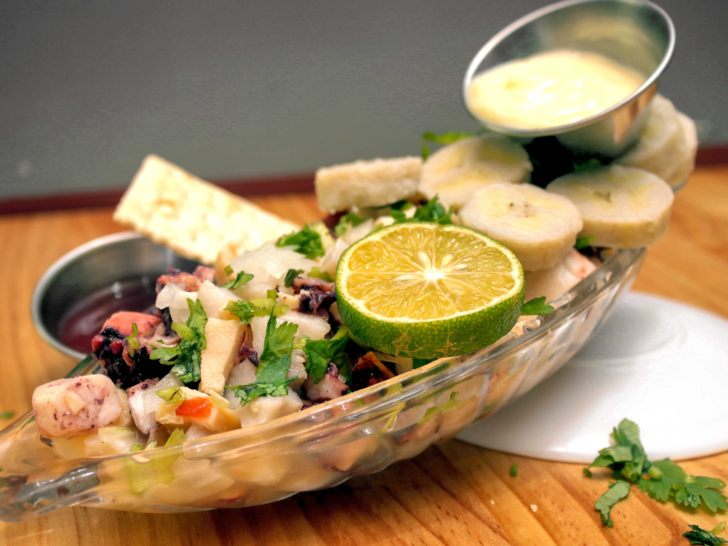 Con pulpo, calamar y pescado sazonado con chile dulce, cebolla y culantro, con un acompañamiento a elegir.