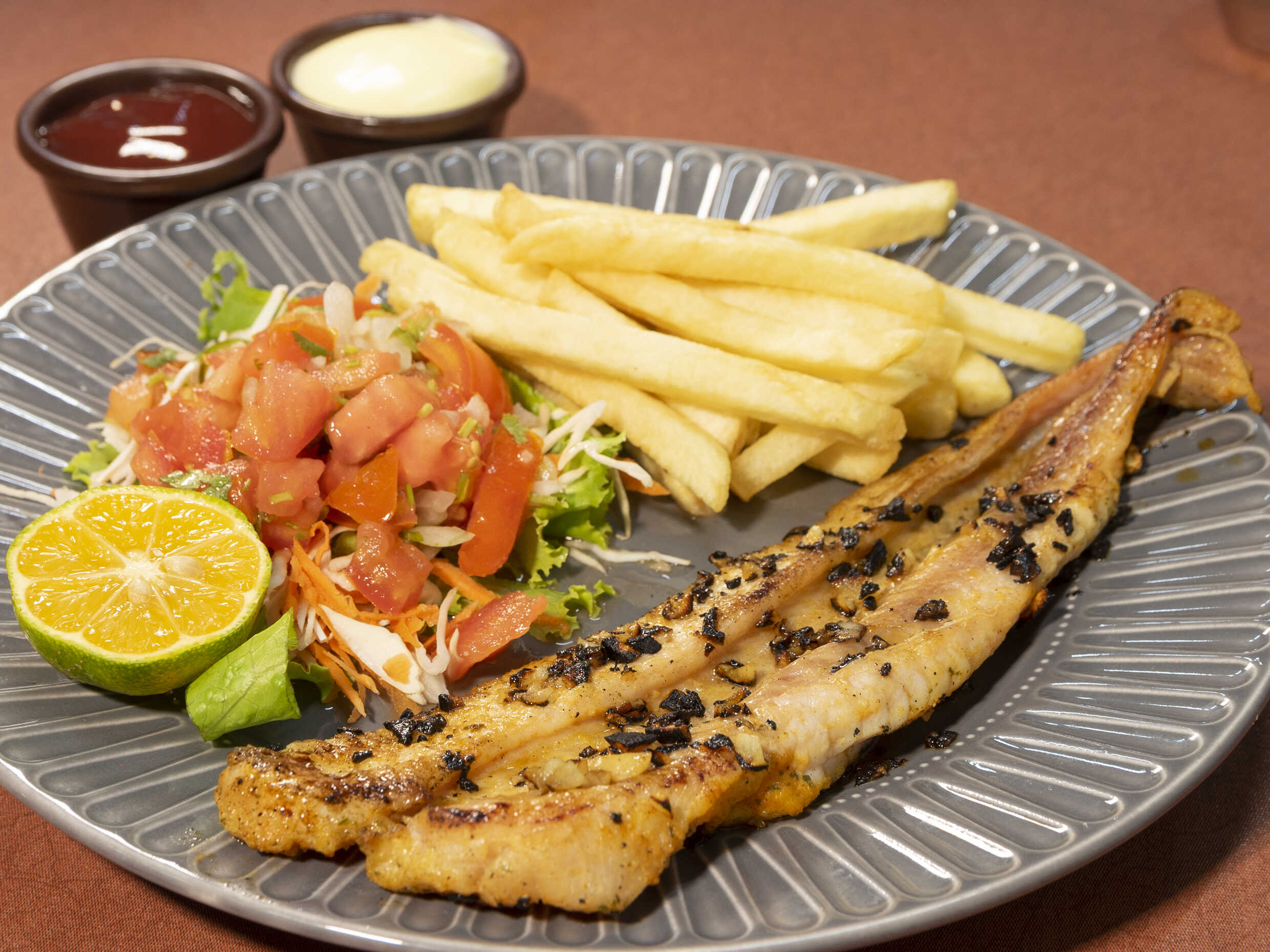 Jugoso filete de pescado a la plancha acompañado con papas fritas y ensalada del día.