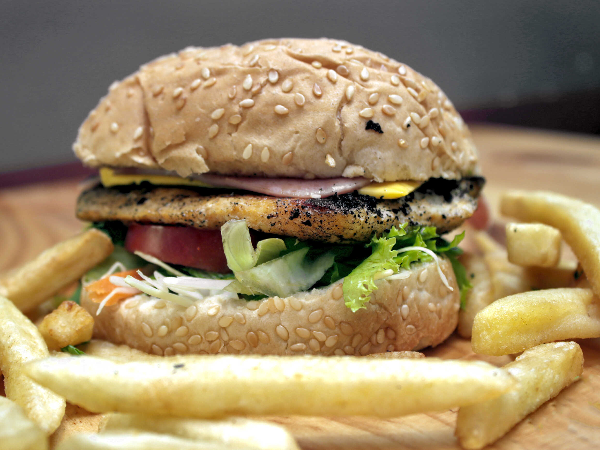 la tradicional hamburguesa rellena de filet de pollo a la plancha , lechuga, tomate, salsas de tomate y mayonesa, jamón y queso. Incluye papas fritas y refresco natural del día.
