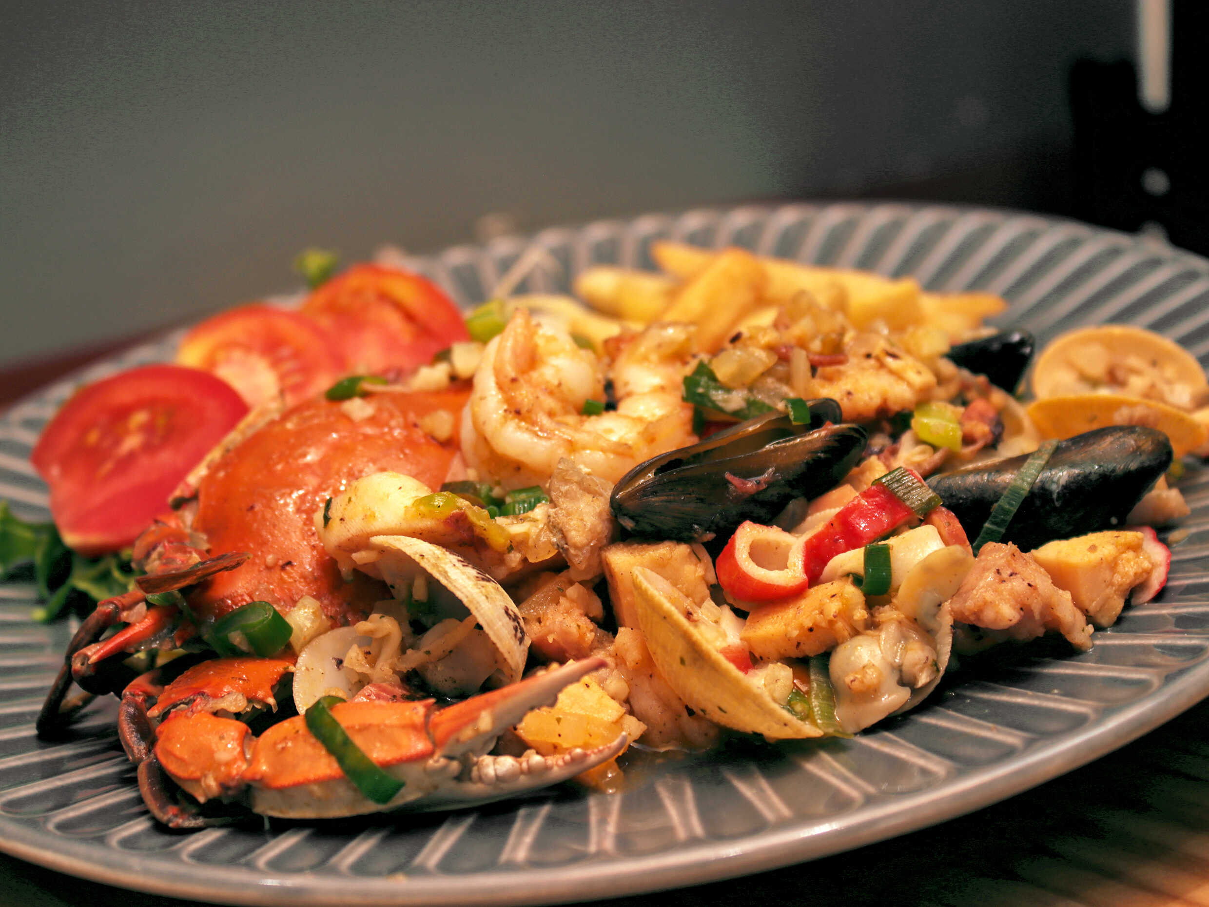 Deliciosa combinación de conchas, mejillones, trozos de pescado, calamares, pulpo, camarón, surimi, cangrejo, todo cocinado con ajo natural, acompañado con papas fritas y ensalada del día.