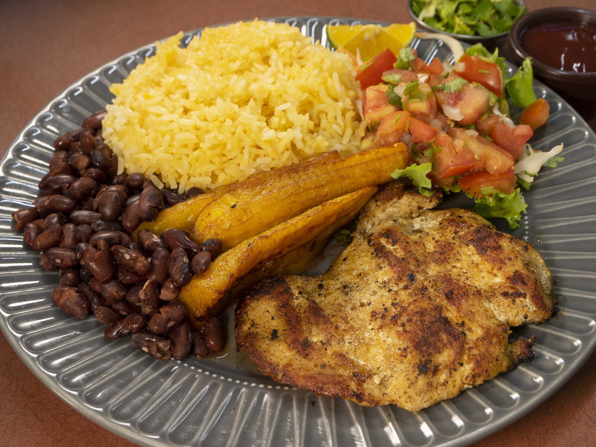 Platillo personal ,250g de arroz, 150g de frijoles, ensalada del día, plátano maduro y la proteina a elegir