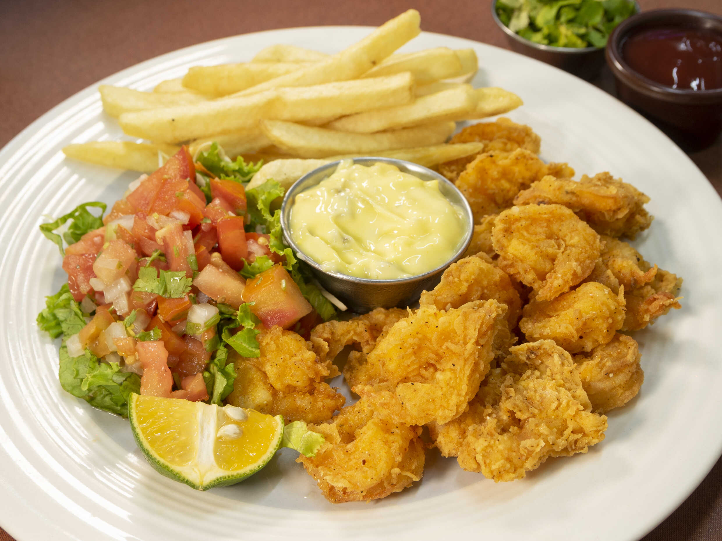 Deliciosos camarones empanizados acompañados con papas frita, salsa tártara y ensalada del día.