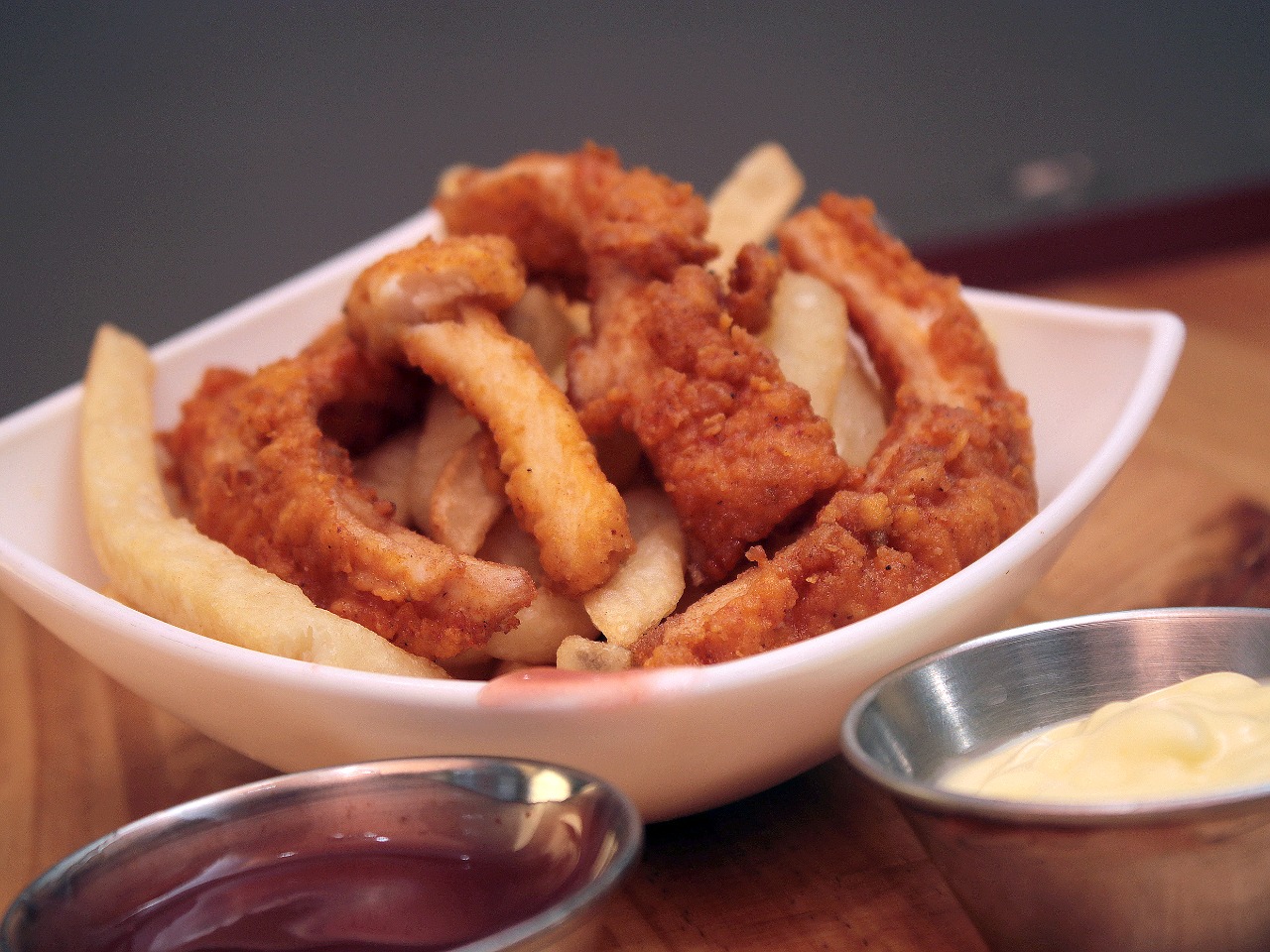 Crujientes papas fritas con trocitos de pollo empanizados.