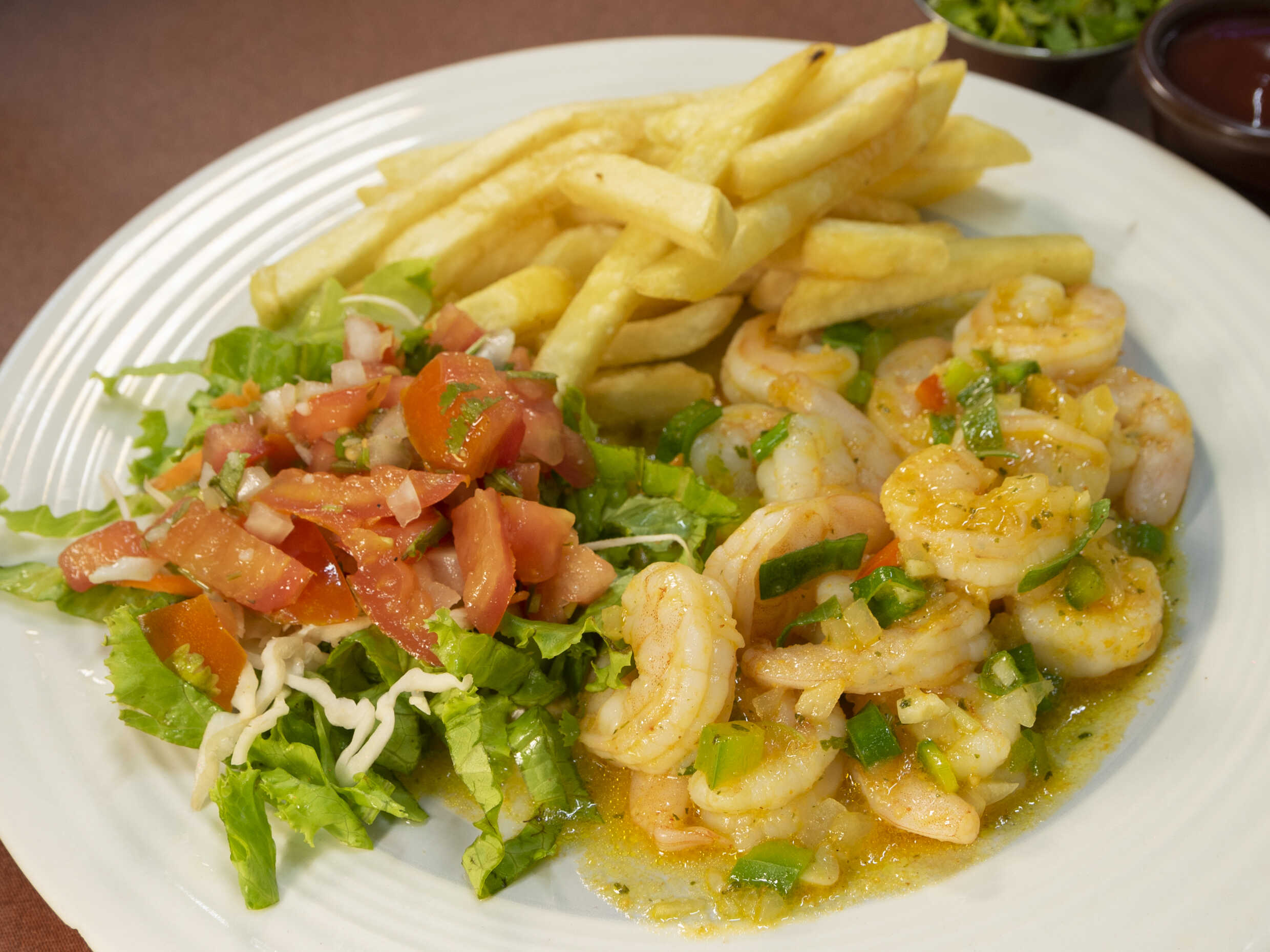 Deliciosos camarones al ajillo, acompañados con papas fritas y ensalada del día.