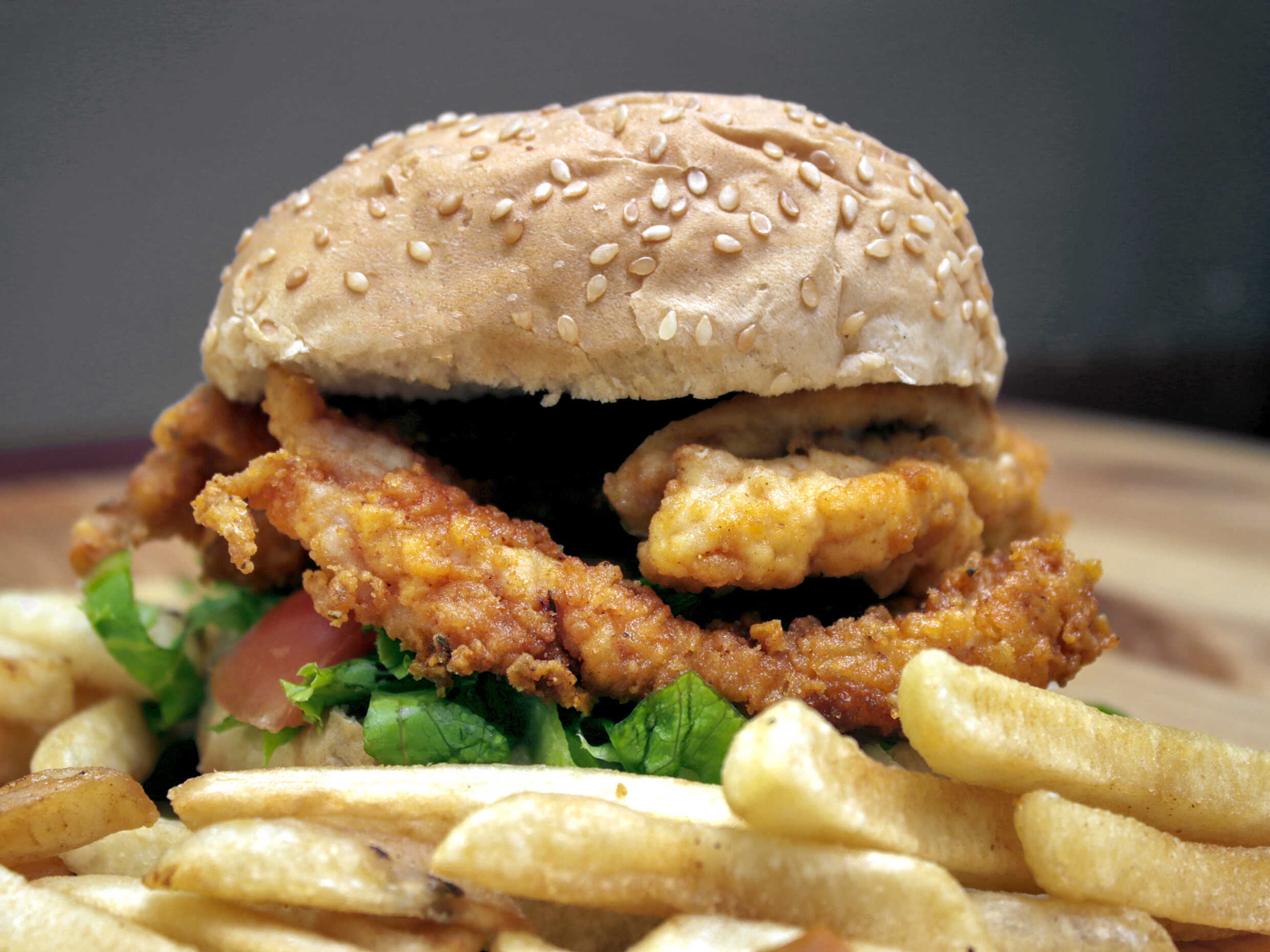 la tradicional hamburguesa rellena de pescado empanizado, lechuga, tomate, salsas de tomate y mayonesa, y salsa tartara. Incluye papas fritas y refresco natural del día.