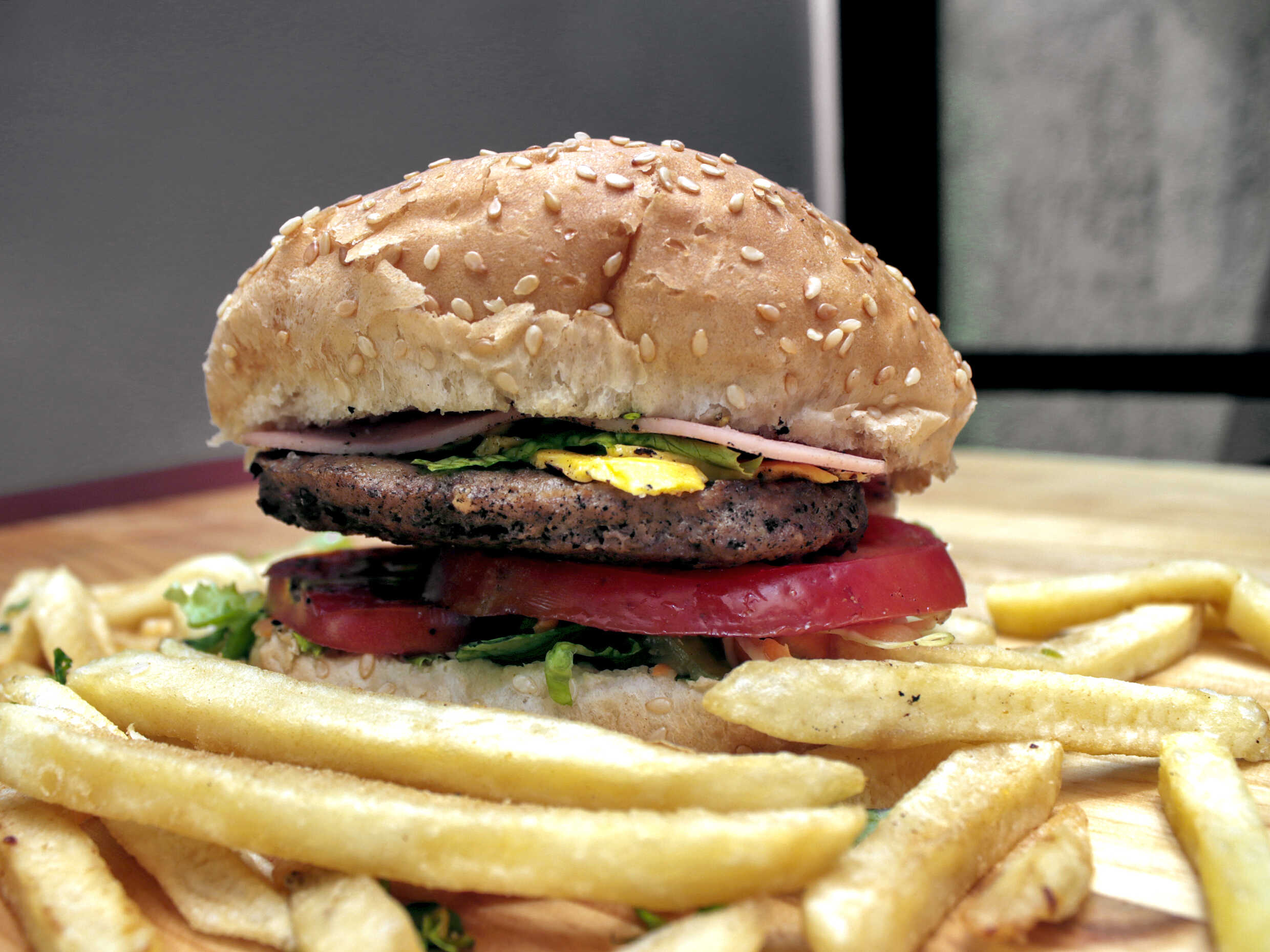 la tradicional hamburguesa rellena de carne, queso y mayonesa,. Incluye papas fritas y refresco natural del día.