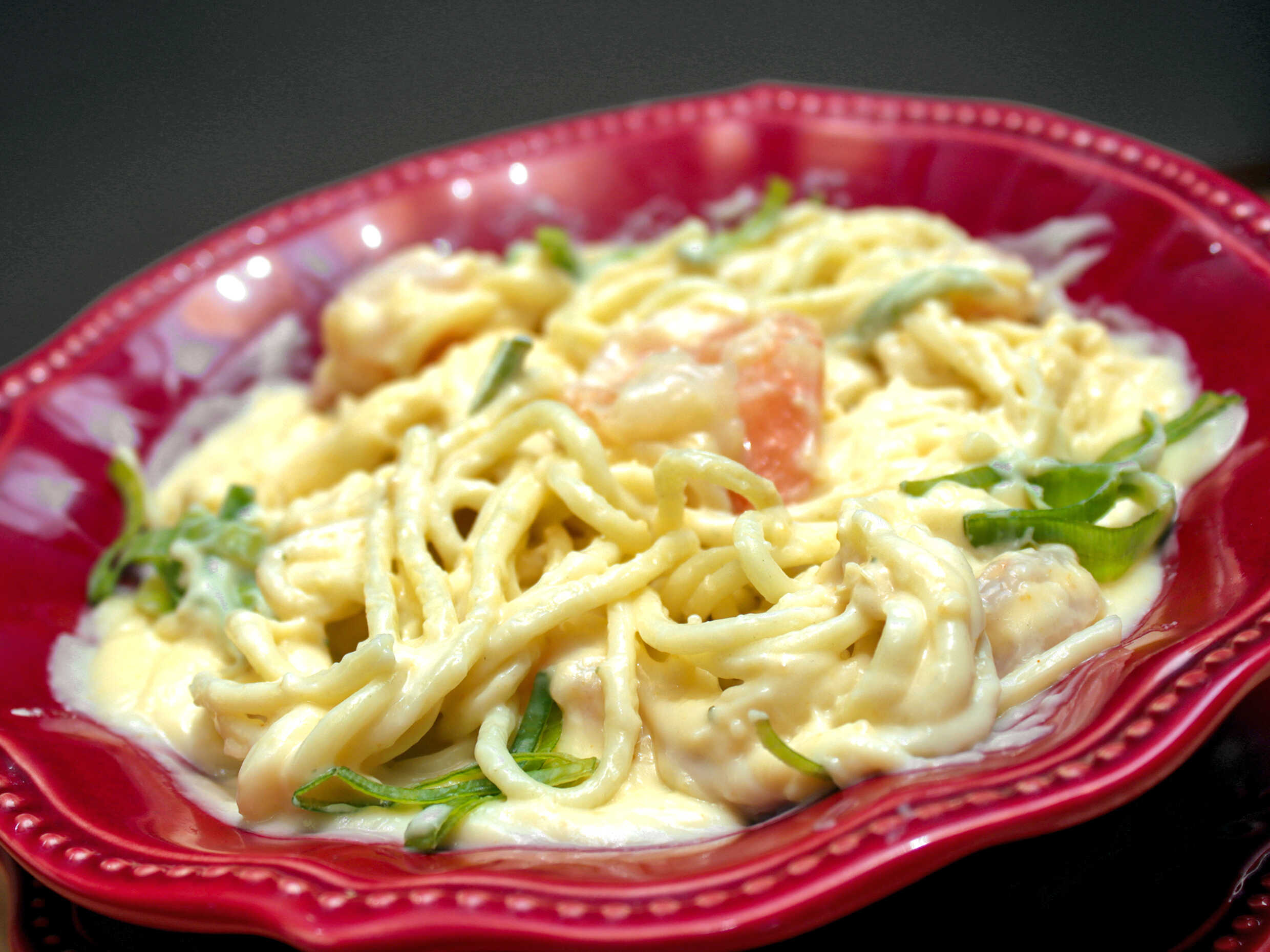 Spaguetti en salsa blanca con mariscos ( pescado, camarón, mejillón, almeja, surime y pulpo)