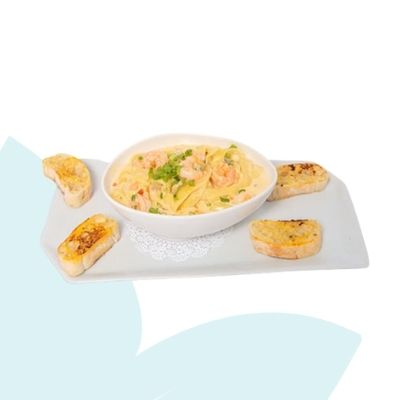Fettuccini fresco, salteado a los camarones, con salsa a elección bechamel o pomodoro, pastas acompañadas con pan de ajo y queso.