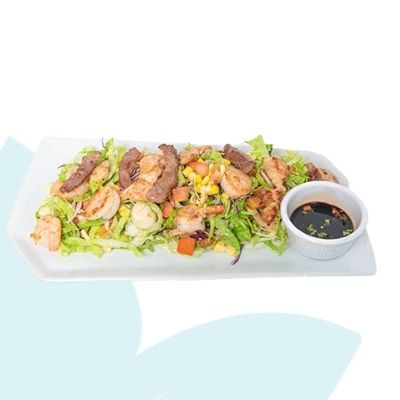 Mix de lechugas, repollo morado, zanahoria, tomate, maíz dulce, camarones al ajillo, pechuga de pollo a grill, lomo de cerdo al grill, con aderezo alioli de limón.
