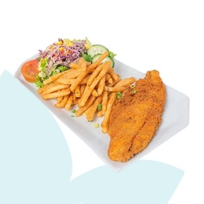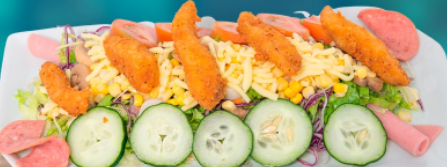 Mix de lechugas, cebolla morada, pepino, maíz dulce, palmito, garbanzos, frijoles rojos, queso turrialba, salami, jamón y dedos de pescado empanizado.