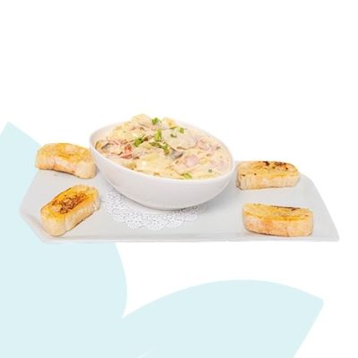 Fettuccini fresco, pollo, jamón, maíz dulce, hongos frescos, en salsa Alfredo, acompañadas con pan de ajo y queso.