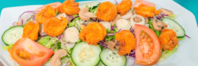 Mix de lechugas, repollo morado, pepino, zanahoria, tomate, maíz dulce y camarones empanizados con coco. Aderezo de alioli culantro y panameño.