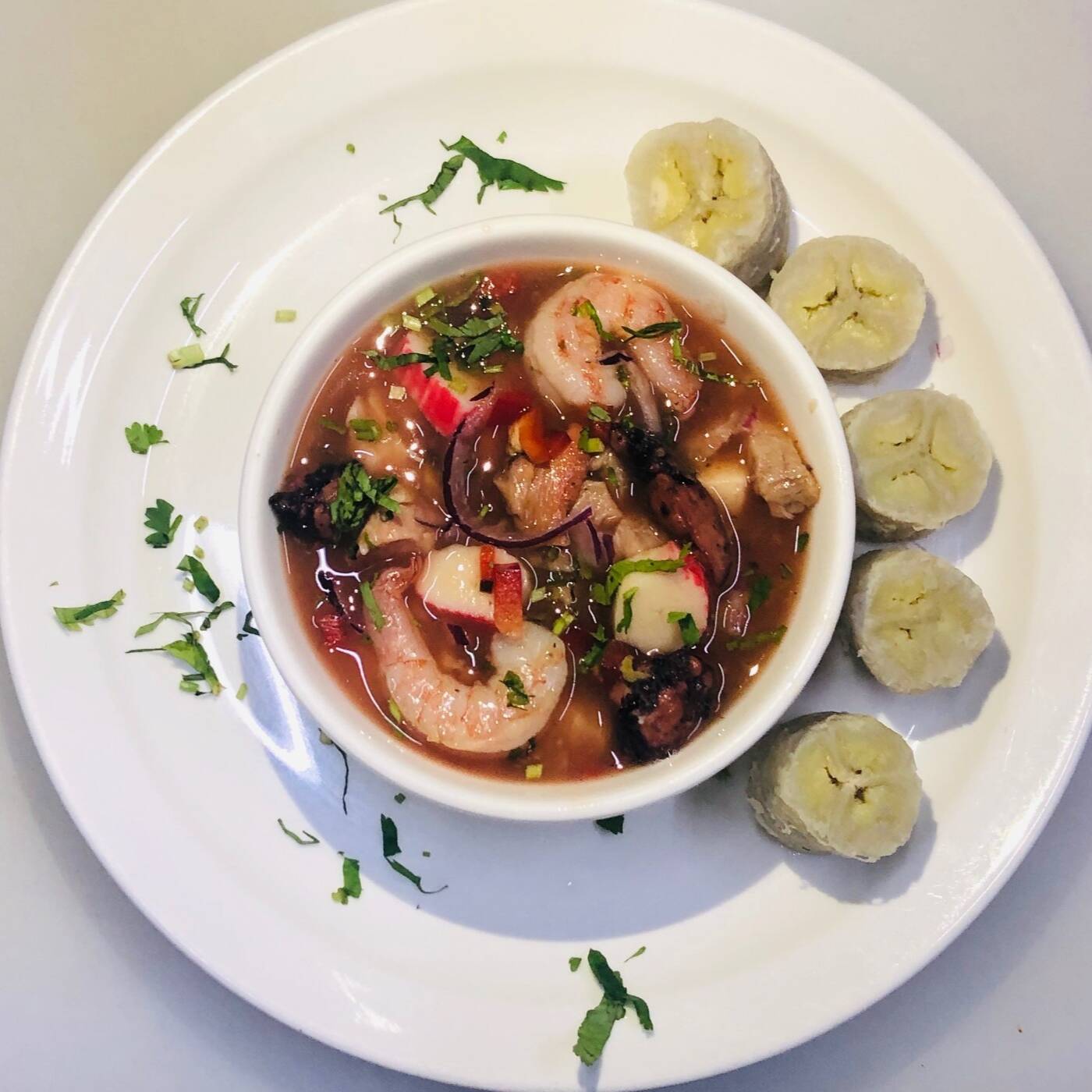 Rico ceviche a base de banano más un acompañamiento a elegir.