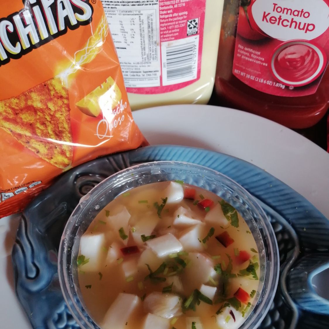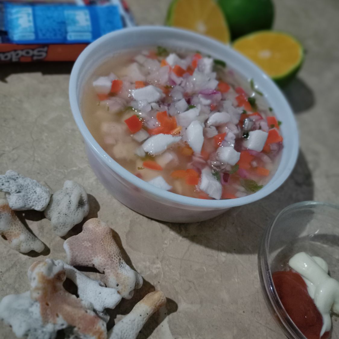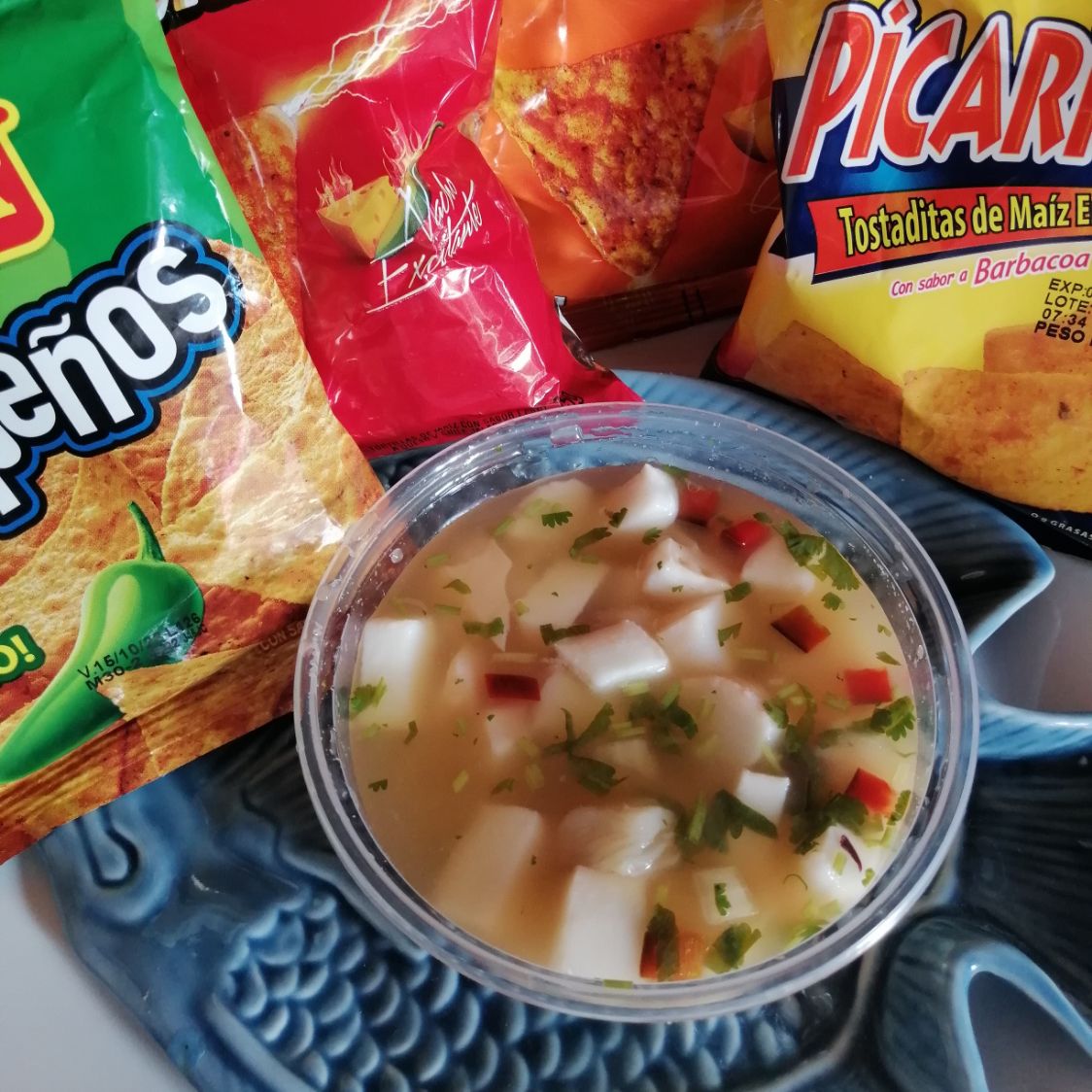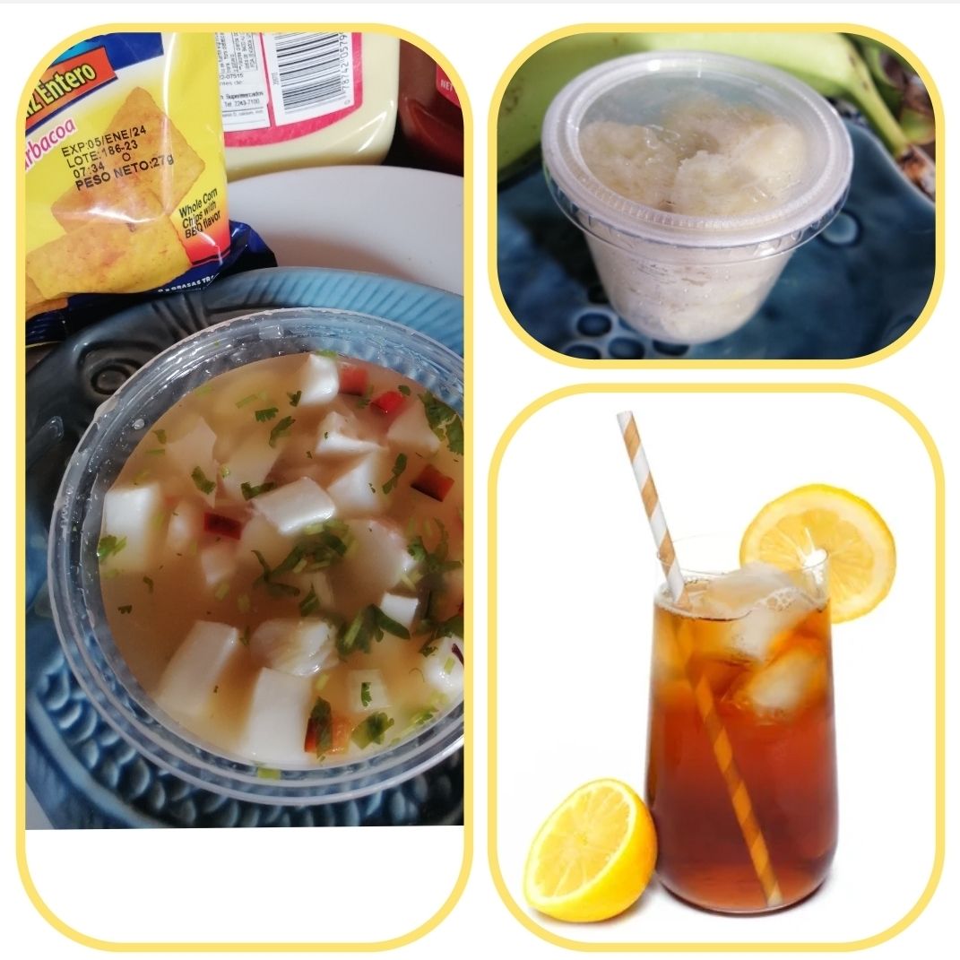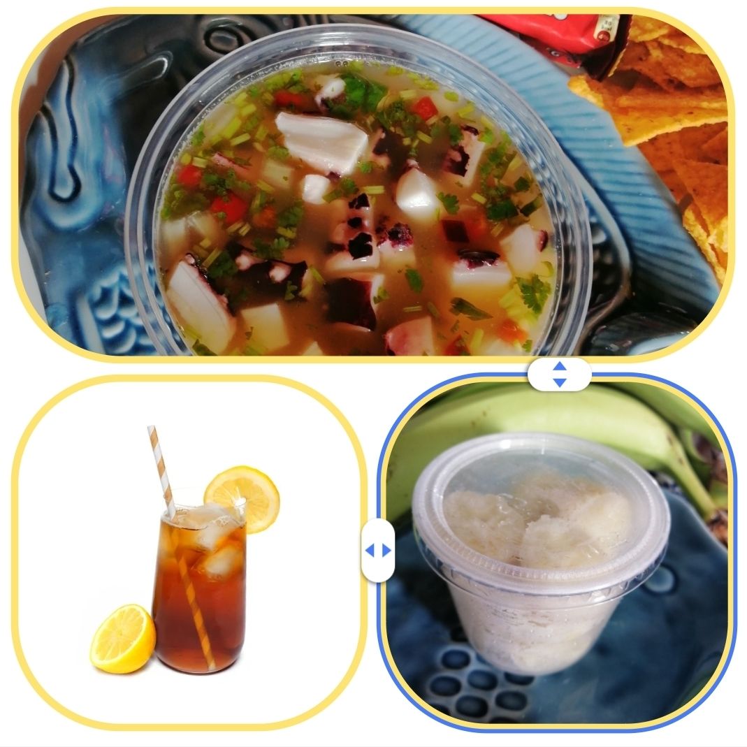 Combo del mejor ceviche de calamar, pulpo, pescado y camarón entero, acompañado de salsa, gaseosa desechable 250 ml y banano verde perfecto para ceviche.