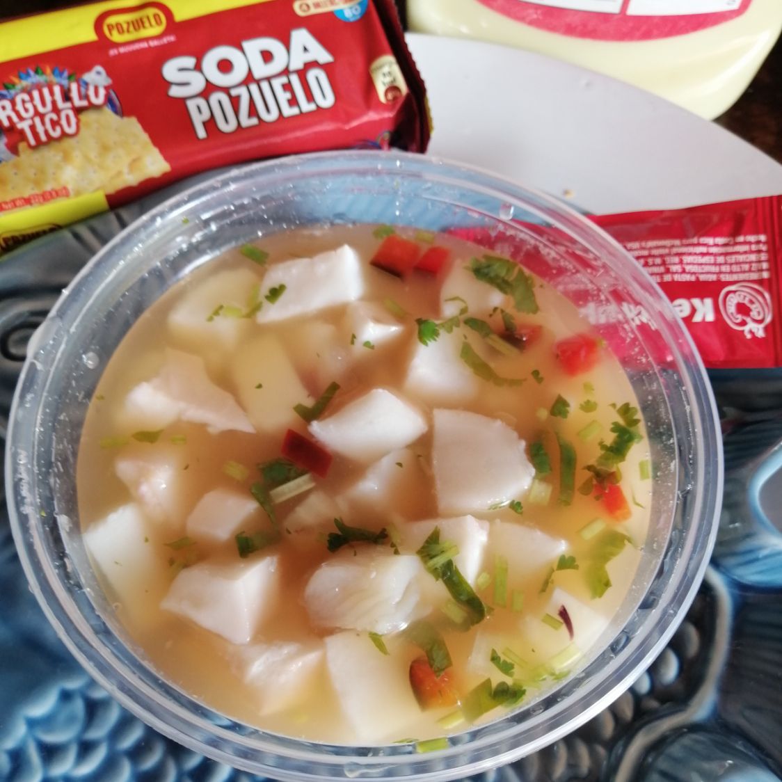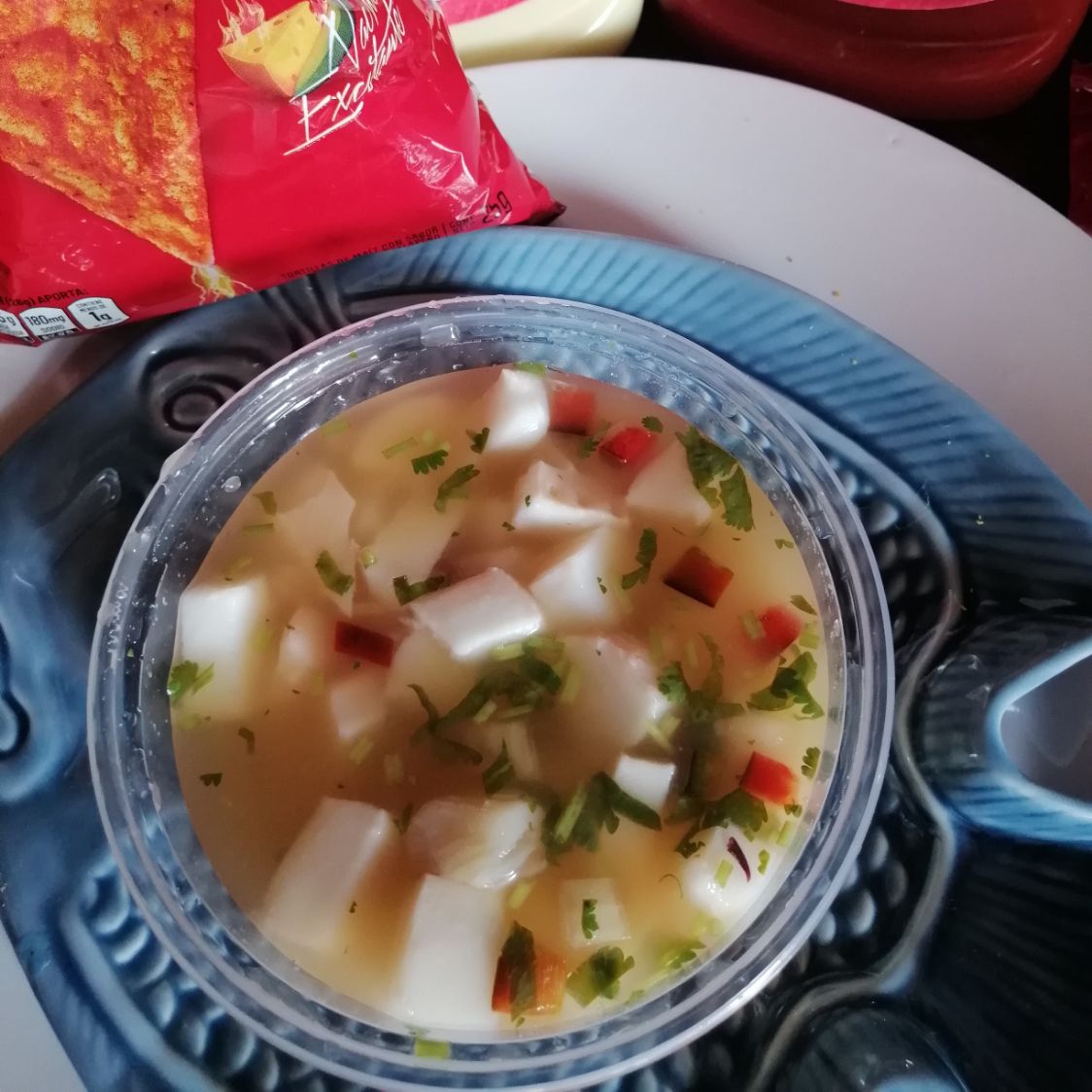 Caldosa picarita acompañada de una gaseosa desechable 250 ml y banano verde perfecta para acompañar el mejor sabor del ceviche.