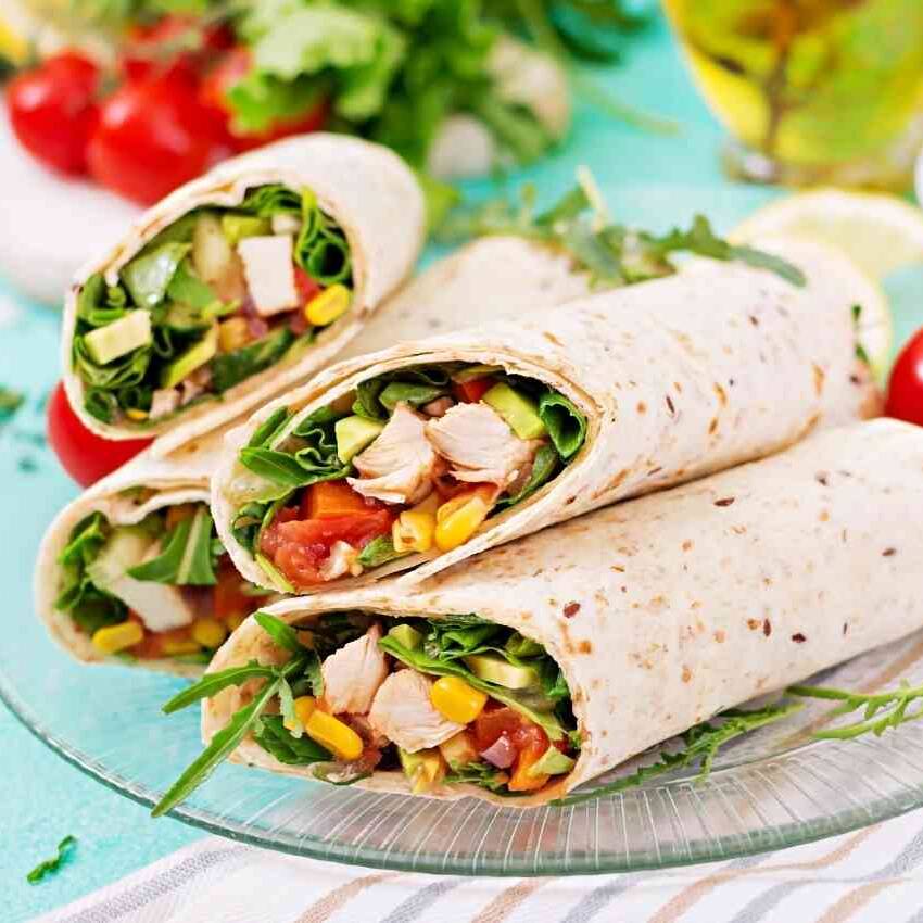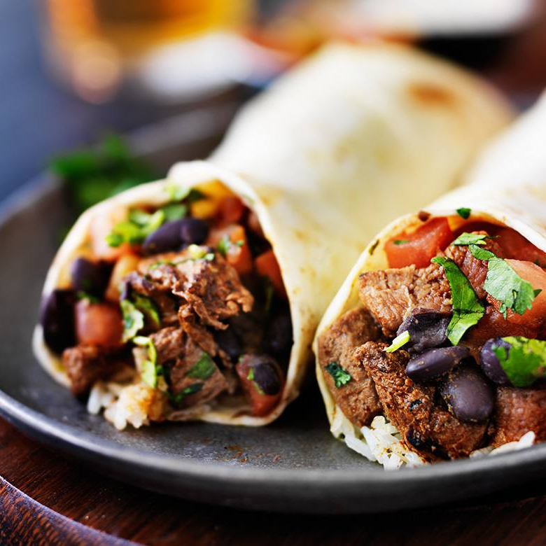 Un burrito de carne especial de cerdo, vegetales, aderezo de chef, frijoles molidos y olores con un toque de limon tahiti.