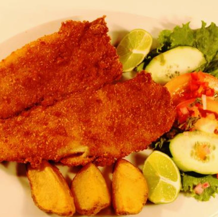 Delicioso filete cortado en tiras adobado con nuestra receta casera y empanizado acompañado de papas, ensalada y salsa Alioli