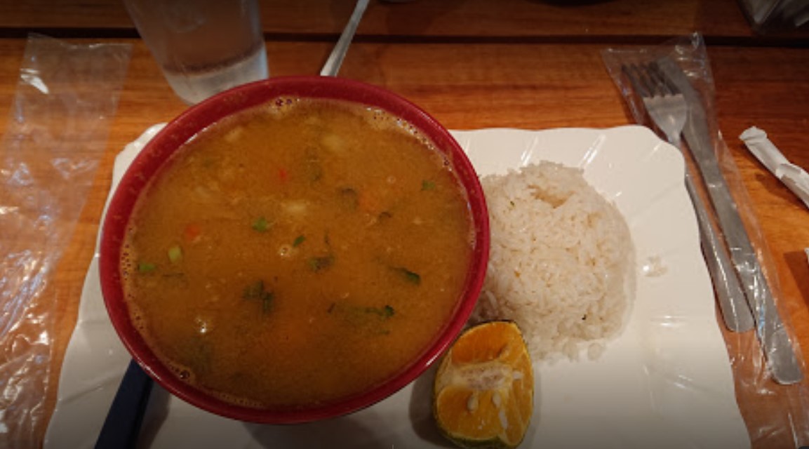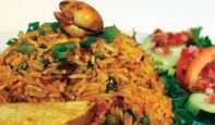 Arroz con pollo y mariscos acompañado de papas y ensalada