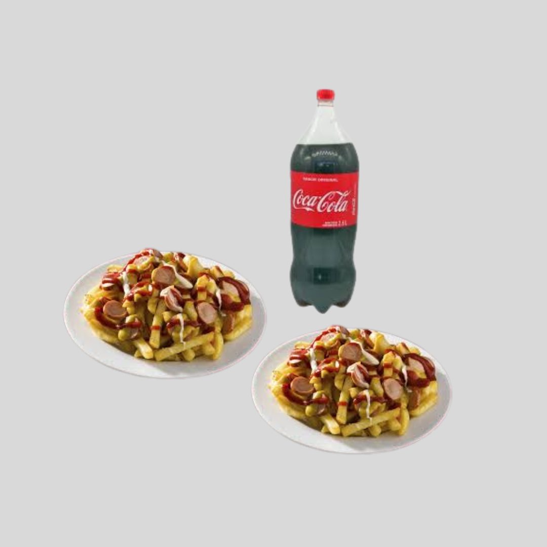 Dos deliciosas salchipapas y una coca cola regular de 2.5 litros