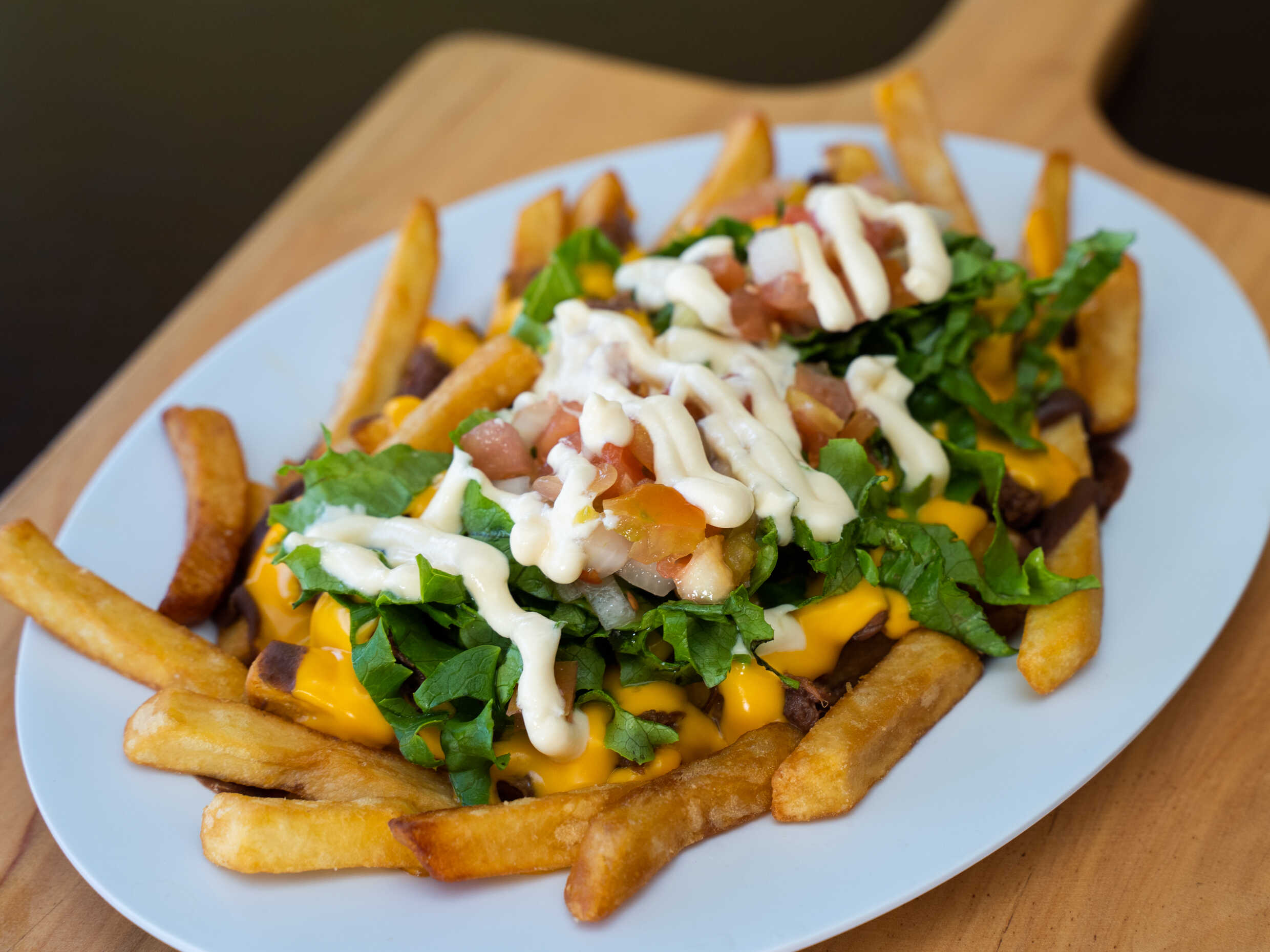 Papas a la francesa con carne mechada, frijol molido y queso cheddar.