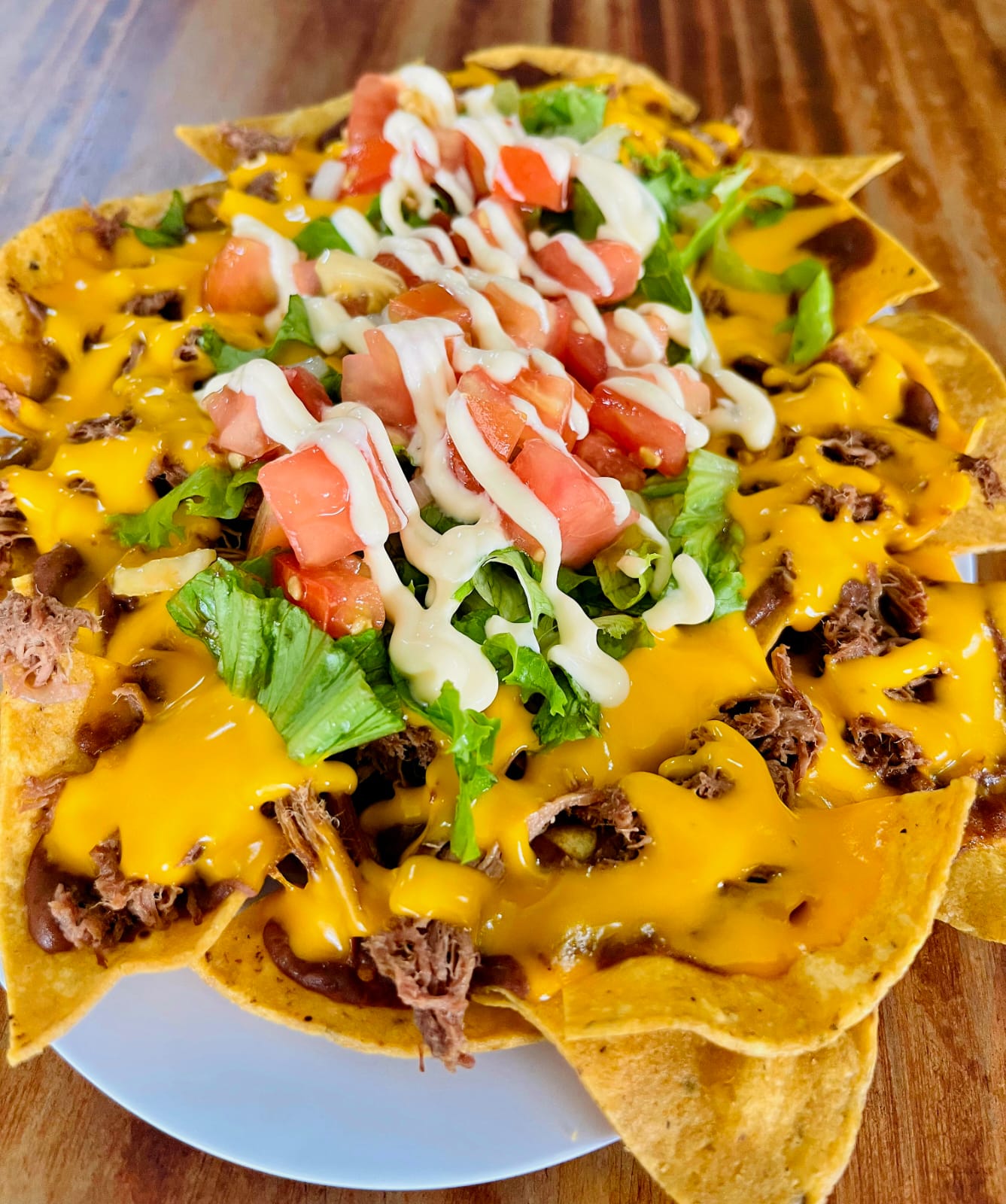 Deliciosos nachos con carne desmechada.frijol molido,y salsa de queso