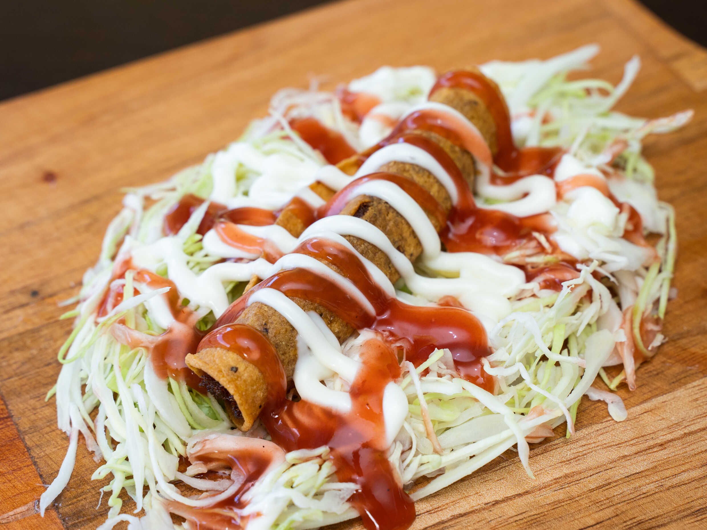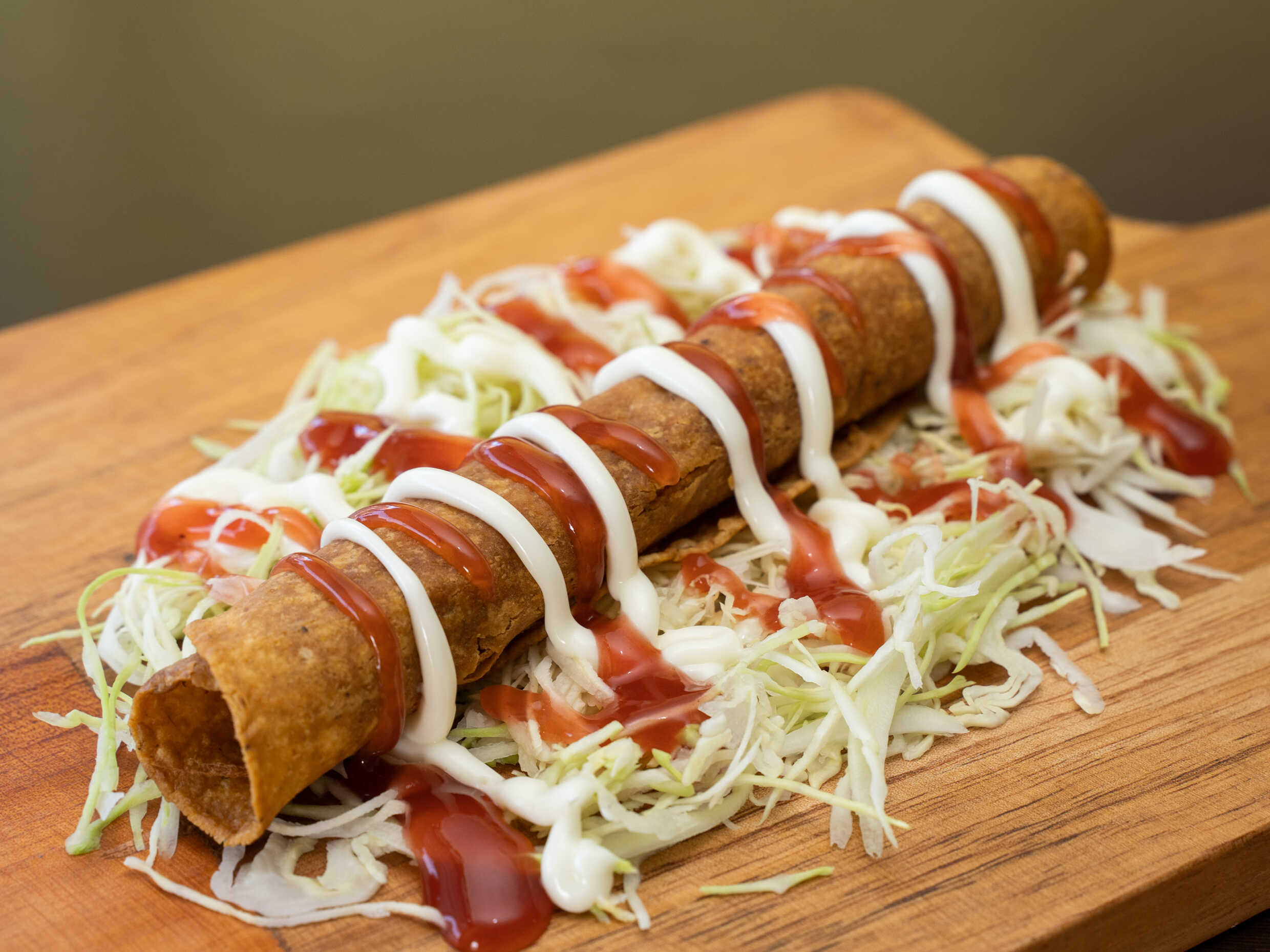 Delicioso taco de carne,con repollo y salsas.