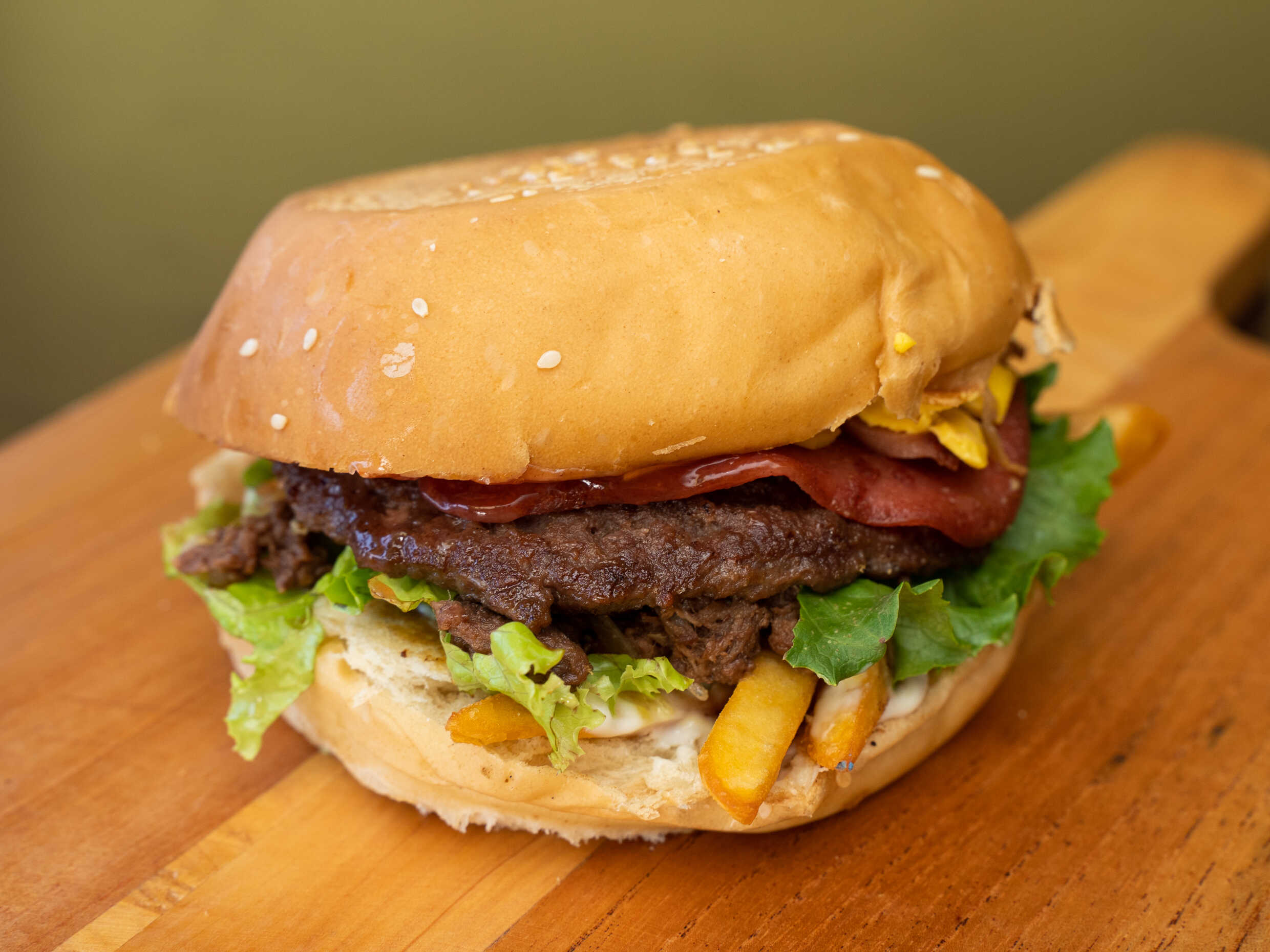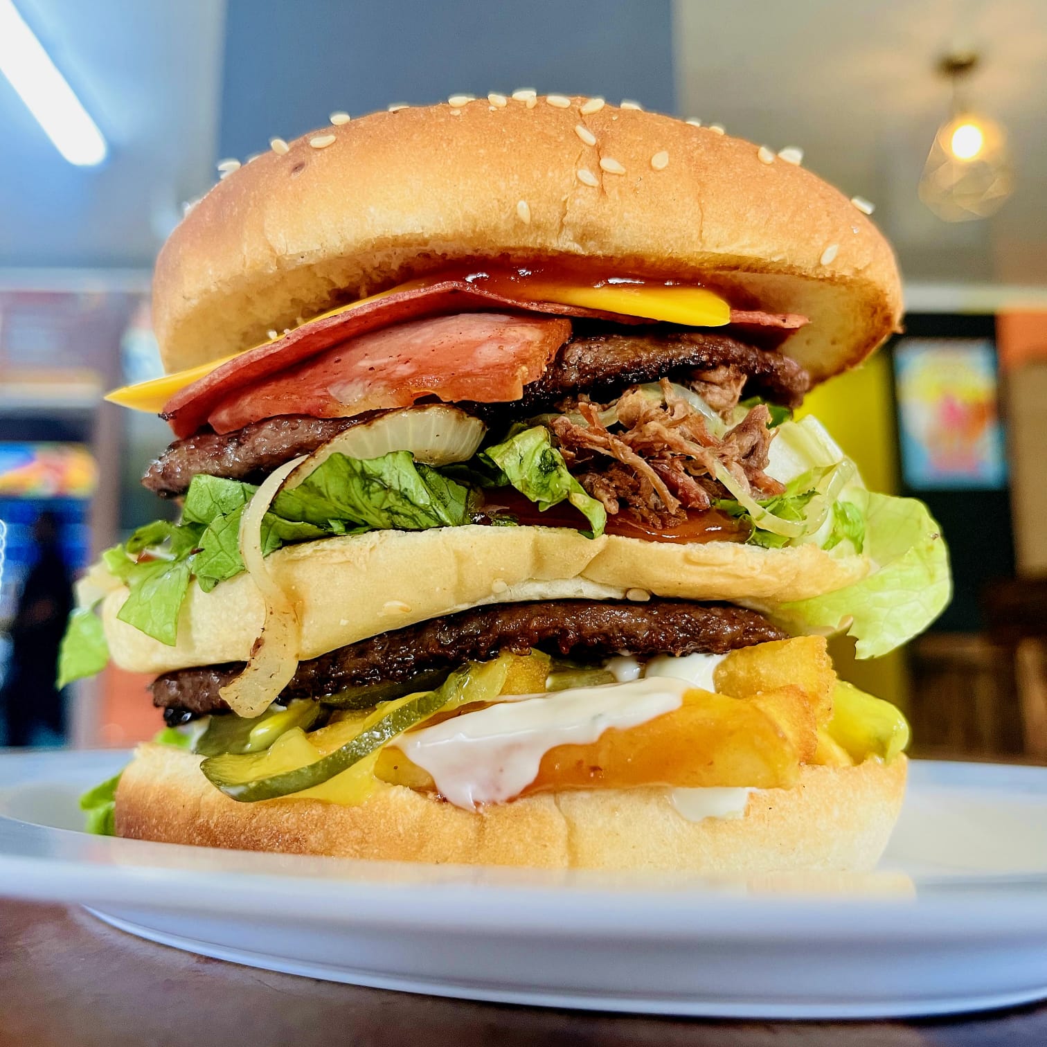 Hamburguesa con 3 panes 2 tortas de carne, queso amarillo, jamón, tocineta, carne mechada, papas adentro de la hamburguesa, lechuga, cebolla, pepinillo y salsas