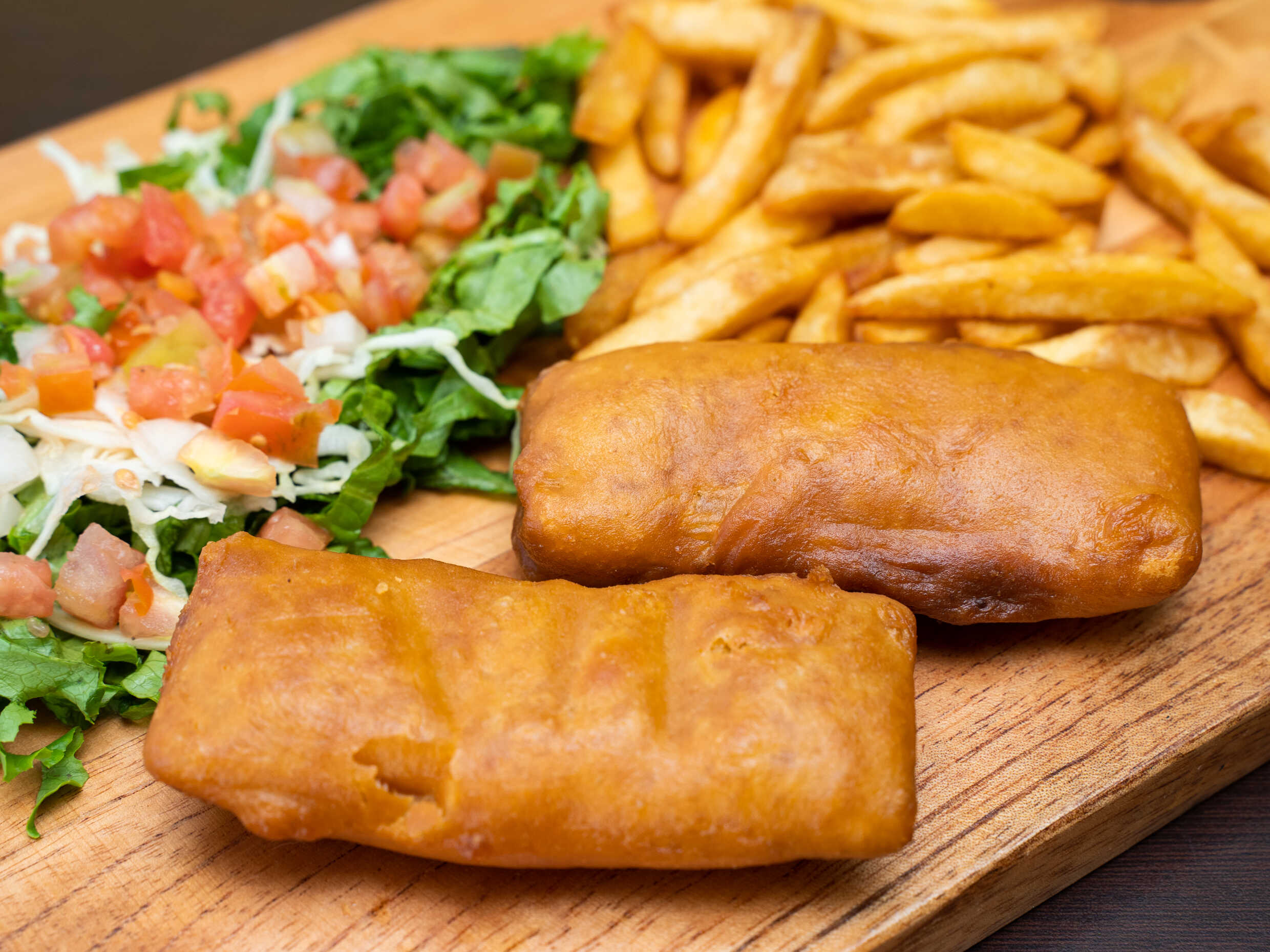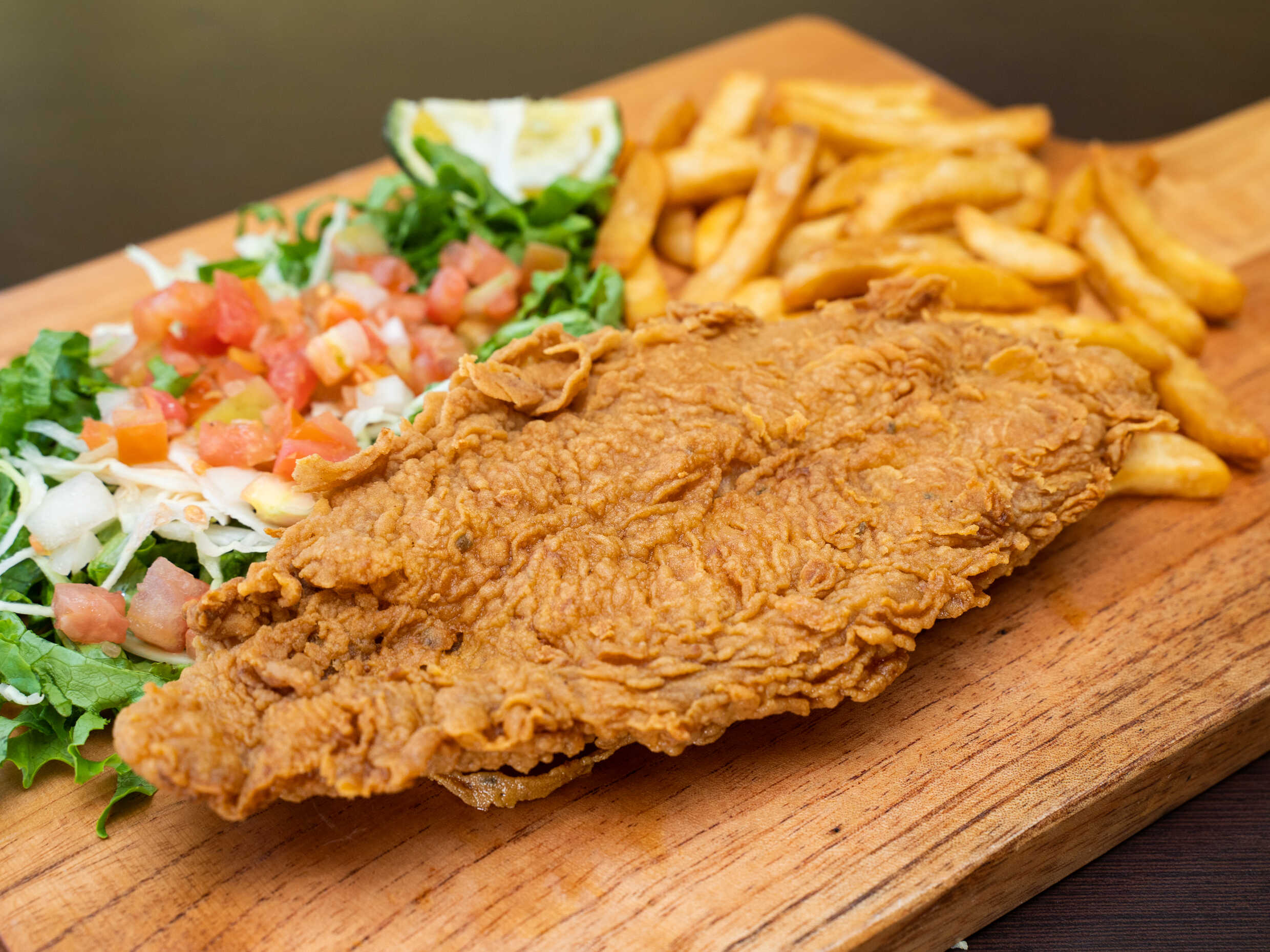 Delicioso filete de pescado con papas y ensalada.