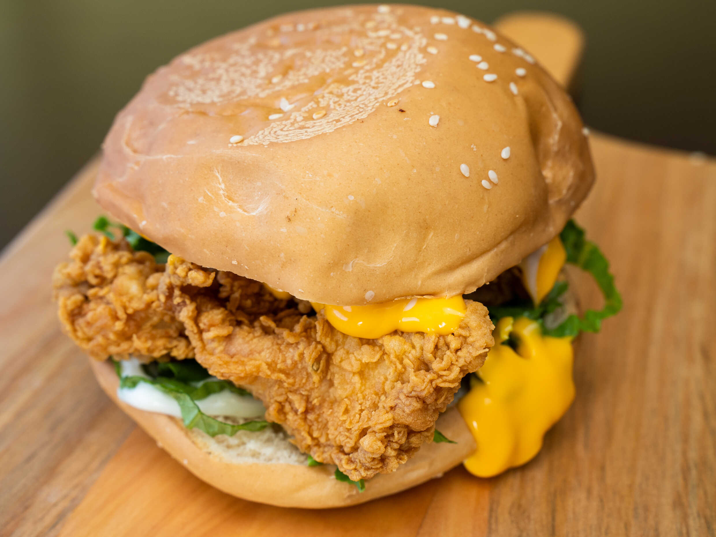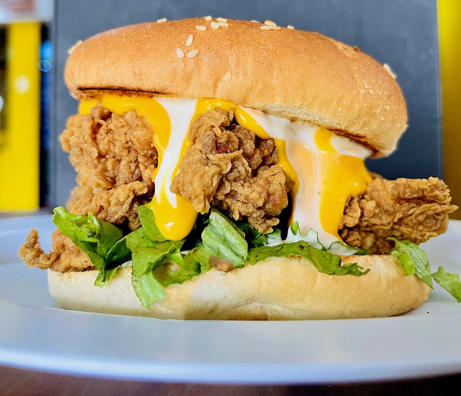 Sabrosa hamburguesa con fajitas de pollo empanizadas,queso cheddar y mayonesa..
