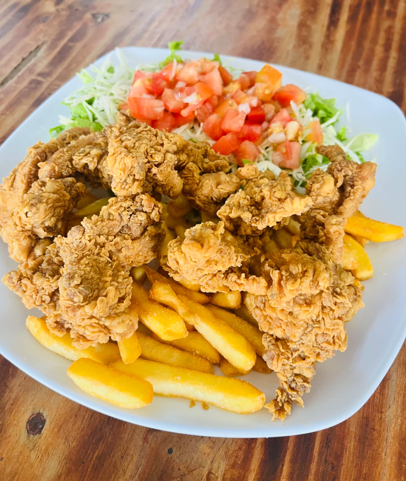 Seis piezas de fajitas de pollo empanizadas acompañadas de papas fritas y ensalada