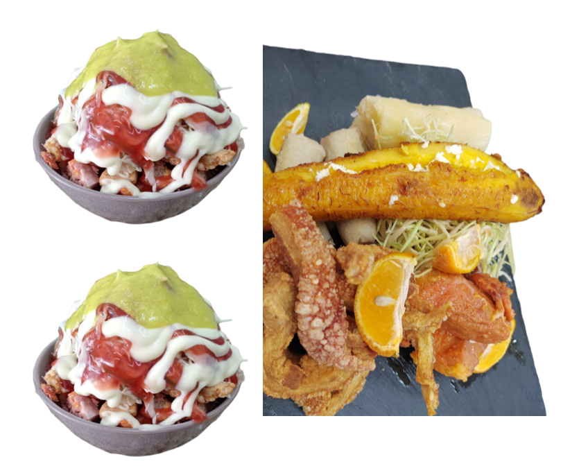 2 enyucados de plátano, maduro relleno de queso mozzarella, 200 g de chicharrón de carne y frijoles molidos, acompañados de yuca frita y ensalada con sus salsas y guacamole.
