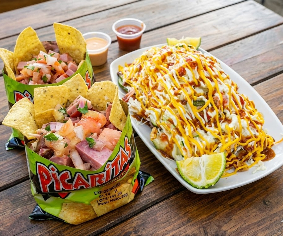 Deliciosa picarita, un arregladito de repollo rayado, zanahoria, culantro y pepino, 250 g de chicharrón de carne y 250 g de tostado con salsa de tomate, mayonesa y guacamole caseros.
