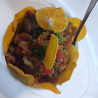 Arroz con frijol bayo, chicharrón en trozos, pico de gallo y limón.